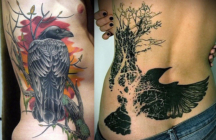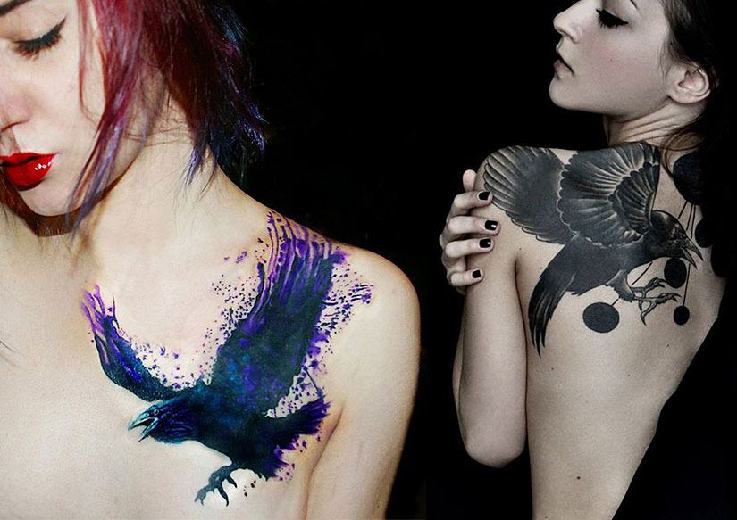 Corbeau noir: signification de tatouages inhabituels avec un oiseau