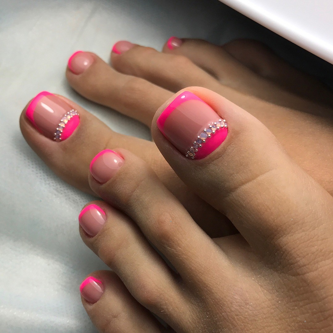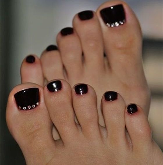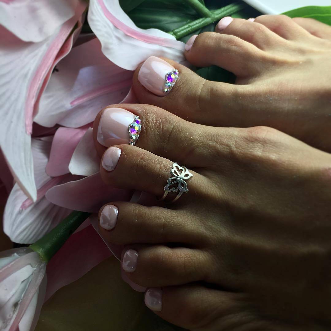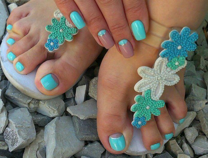 Si vous constatez que les pochoirs sont terminés mais que vous souhaitez réellement effectuer une pédicure lunaire, nous vous expliquerons comment gérer cette situation. Vous aurez besoin d'un peu de patience et de connaissances en technologie. Pour commencer, prenez un vernis décoratif et appliquez-le le long du contour de la base de l'ongle (lunula). La ligne doit être plate et proportionnée. Ce n'est pas obtenu de tout le monde la première fois, mais il n'est pas nécessaire d'être contrarié. Essuyez le contour mal dessiné du vernis décoratif et dessinez-le à nouveau. Vous devez vous efforcer d’obtenir la forme du «croissant», dessinez-le aussi uniformément que possible, un crayon à lèvres vous aidera dans cette affaire. Tracez une ligne en gras avec un crayon, effacez l'excès avec un coton-tige (trempé dans du démaquillant). Les excès de vernis décoratif sur la lunule peuvent être éliminés à l'aide d'un dissolvant pour vernis à ongles. Enduisez le reste de la plaque à ongles avec du vernis, vous pouvez immédiatement utiliser deux couches de vernis. En utilisant un vernis de couleur différente, vous pouvez corriger les irrégularités de la dernière couche de vernis. Si vous souhaitez embellir vos ongles, utilisez des strass, des petits cailloux, des dessins, etc. Il n'y a pas d'ordre pour placer des strass et des cailloux, ils peuvent être situés au hasard sur toute la surface de l'ongle ou seulement sur une partie de la base. A la fin, appliquez une couche de finition.