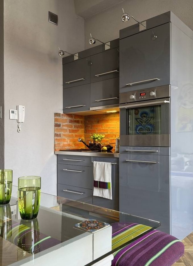 L'éclairage devrait être adéquat. Par conséquent, vous devriez penser à des lumières supplémentaires à l'avance s'il y a une petite fenêtre dans la cuisine. Pour économiser de l'espace, les portes peuvent être faites coulissantes.