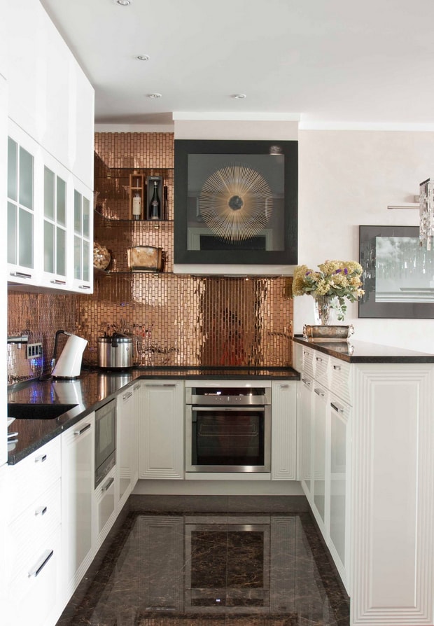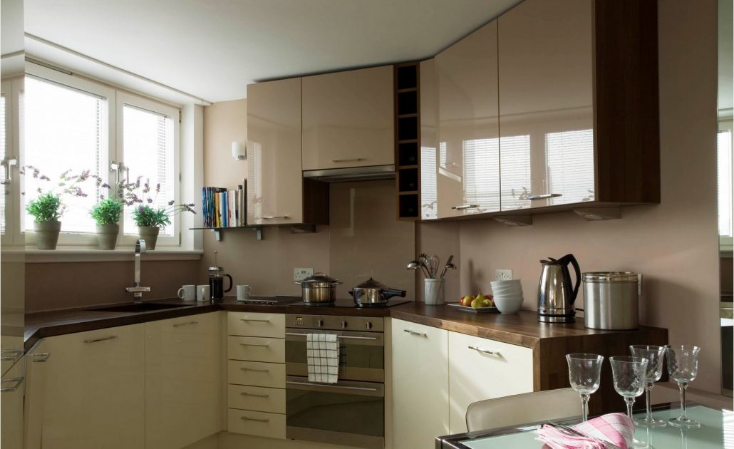 La couleur des meubles ne doit pas correspondre à celle des murs. Les surfaces des miroirs aideront à augmenter la profondeur de la pièce. Les poignées chromées, les étagères en verre ne feront qu'augmenter cet effet. Dans le complexe, la cuisine doit être attrayante et élégante.