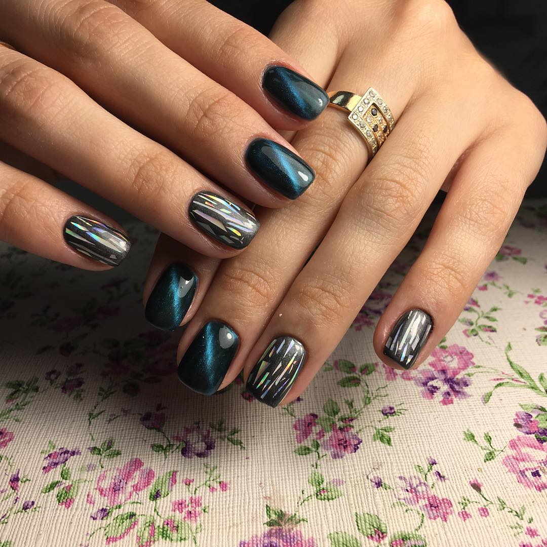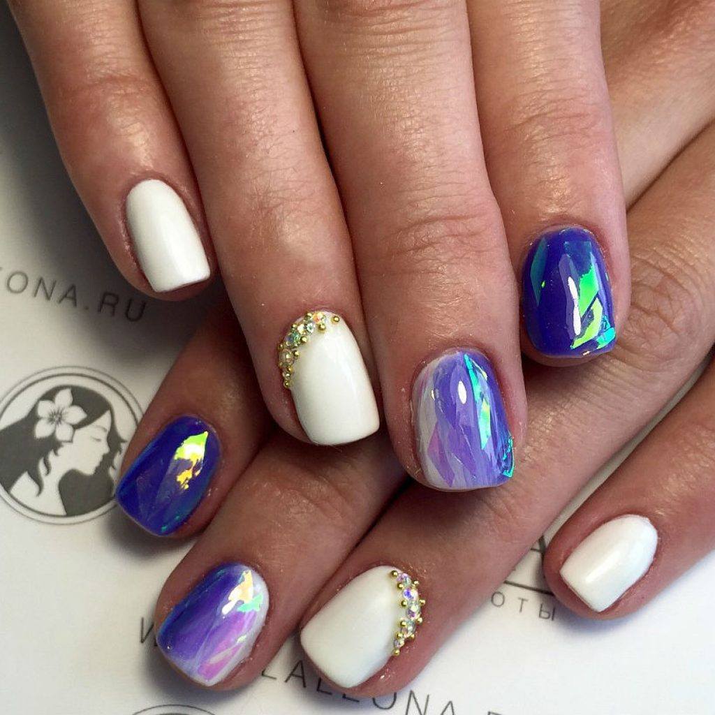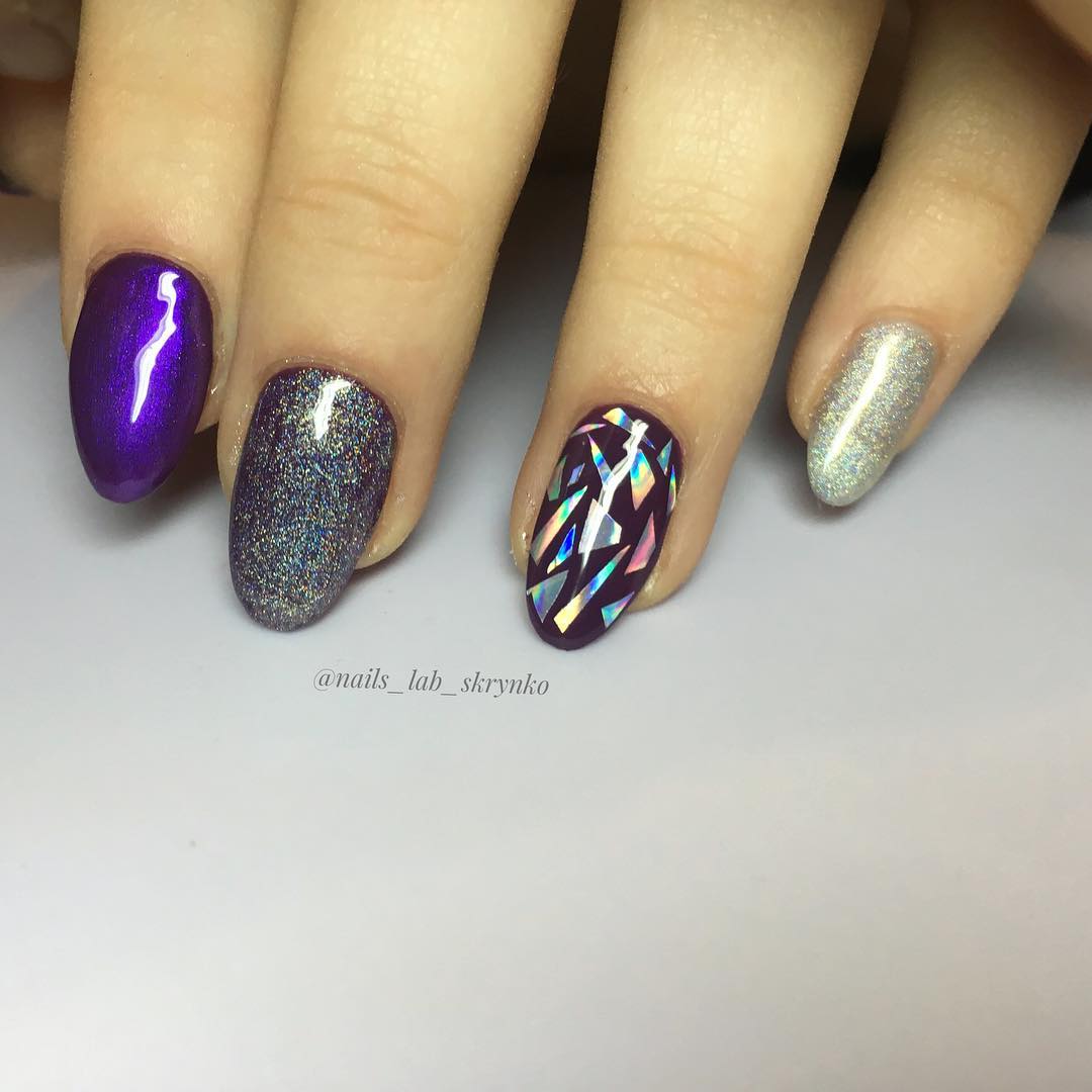 Une manucure réalisée selon cette technique est constituée de morceaux de feuille holographique appliqués sur une plaque à ongles dans un ordre aléatoire ou sous la forme d’un motif spécifique. La gamme de couleurs de ce type de matériau est suffisamment large pour vous permettre de concrétiser vos idées les plus audacieuses et fantastiques.
