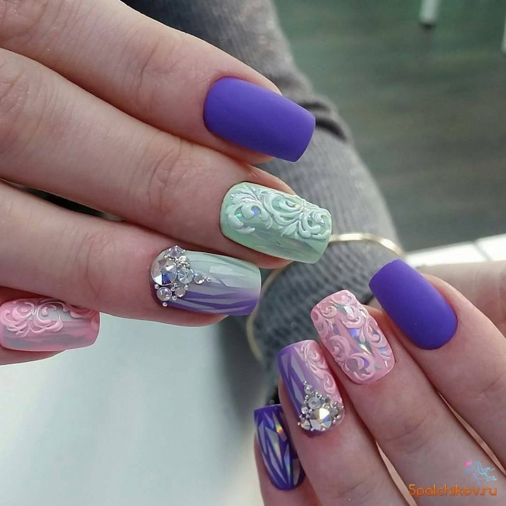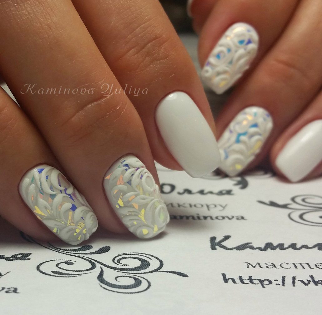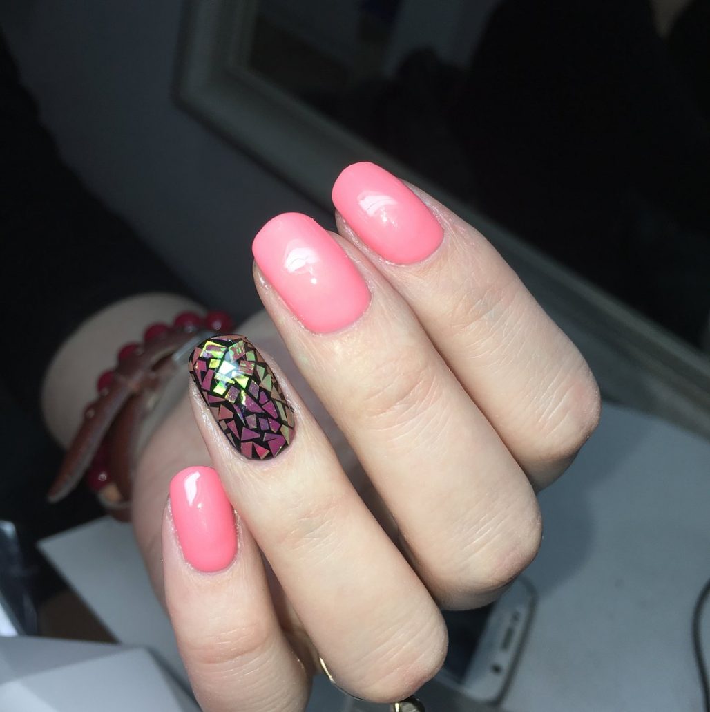 Une manucure réalisée selon cette technique est constituée de morceaux de feuille holographique appliqués sur une plaque à ongles dans un ordre aléatoire ou sous la forme d’un motif spécifique. La gamme de couleurs de ce type de matériau est suffisamment large pour vous permettre de concrétiser vos idées les plus audacieuses et fantastiques.