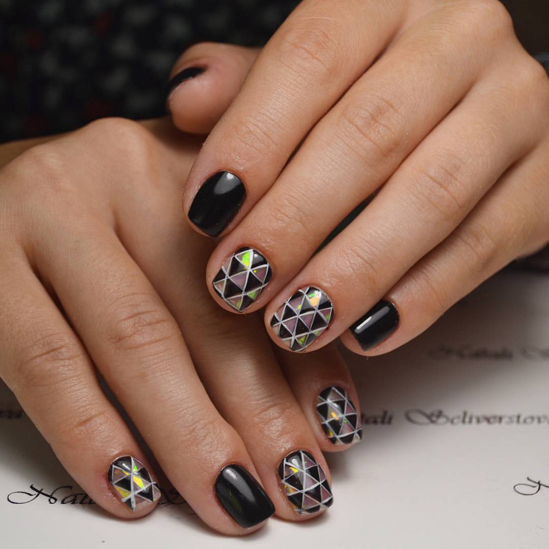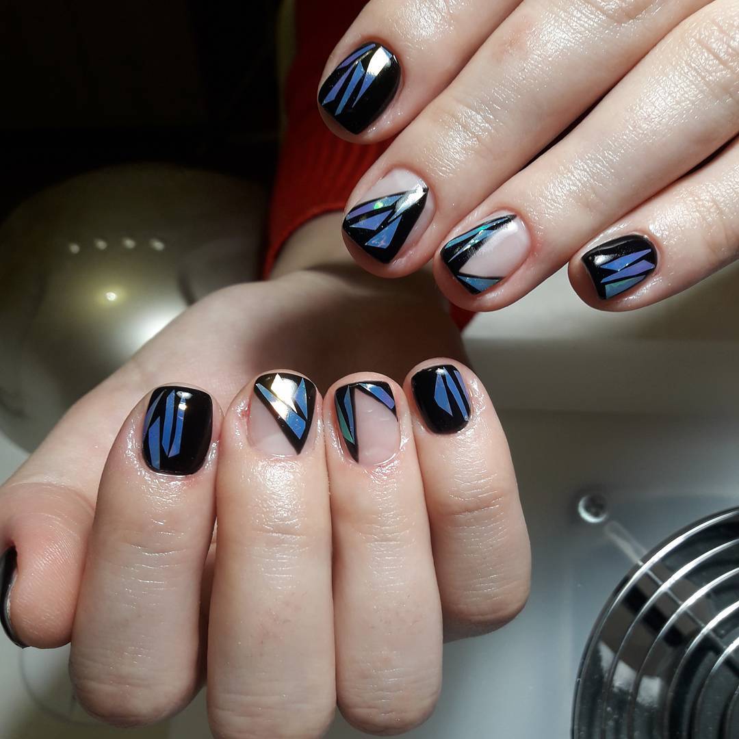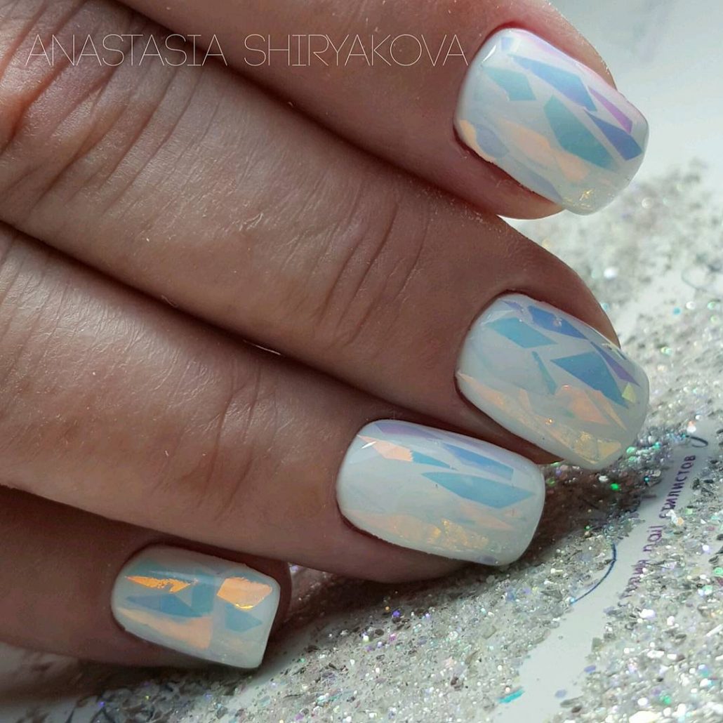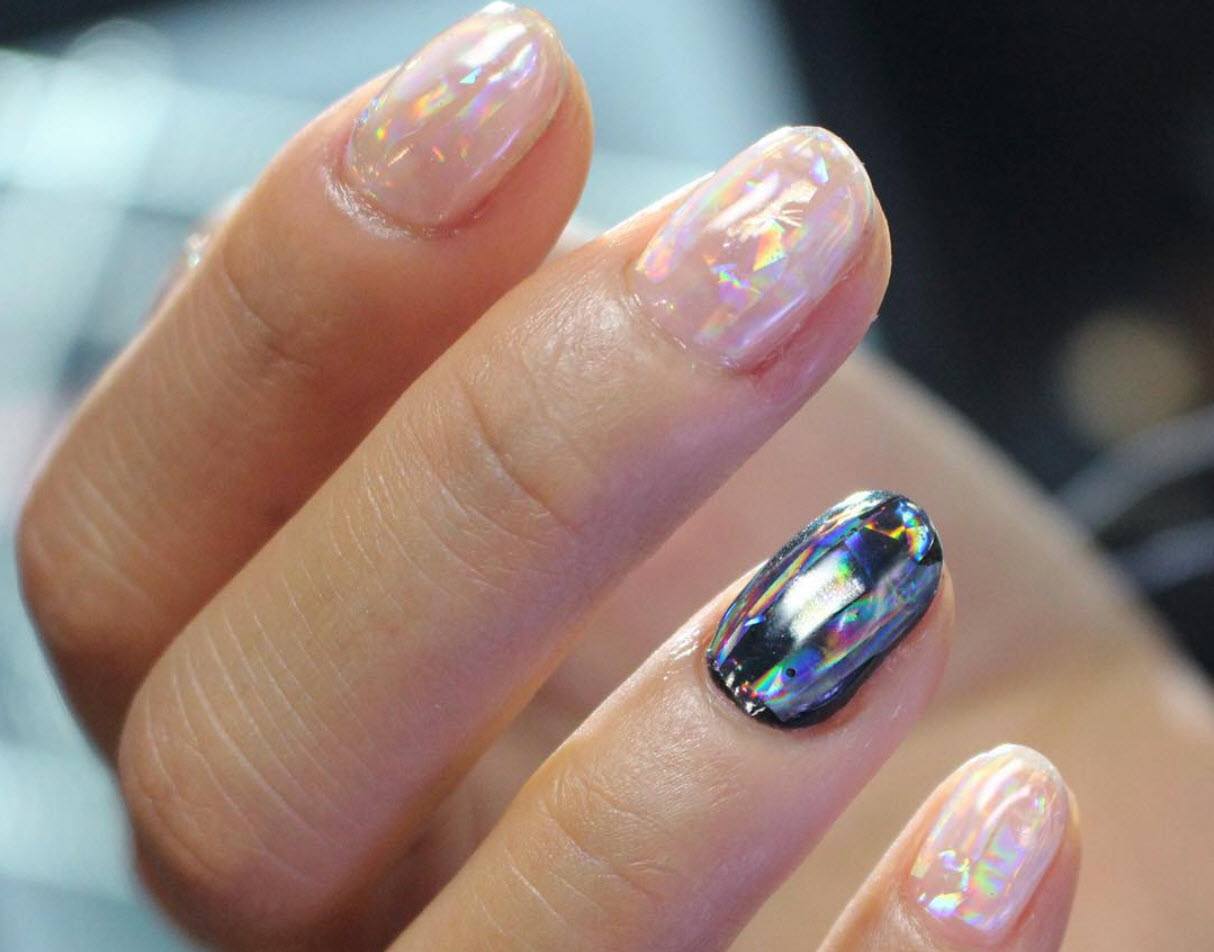 Pour la manucure, appelée «verre brisé», on utilise un film holographique spécial dont des morceaux sont appliqués sur la plaque à ongles. La lumière incidente sur ces pièces est réfractée, créant un débordement spectaculaire et un jeu de couleurs sur les ongles, qui ne peuvent tout simplement pas vous laisser sans surveillance.