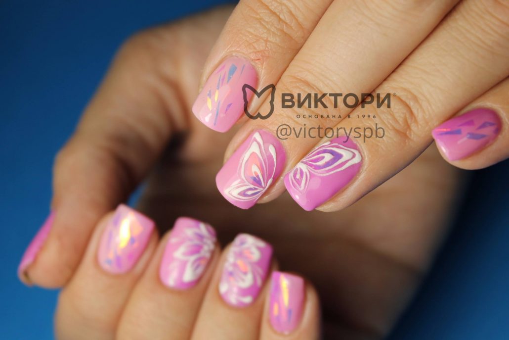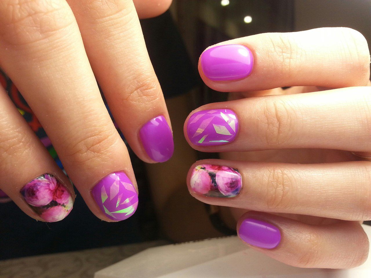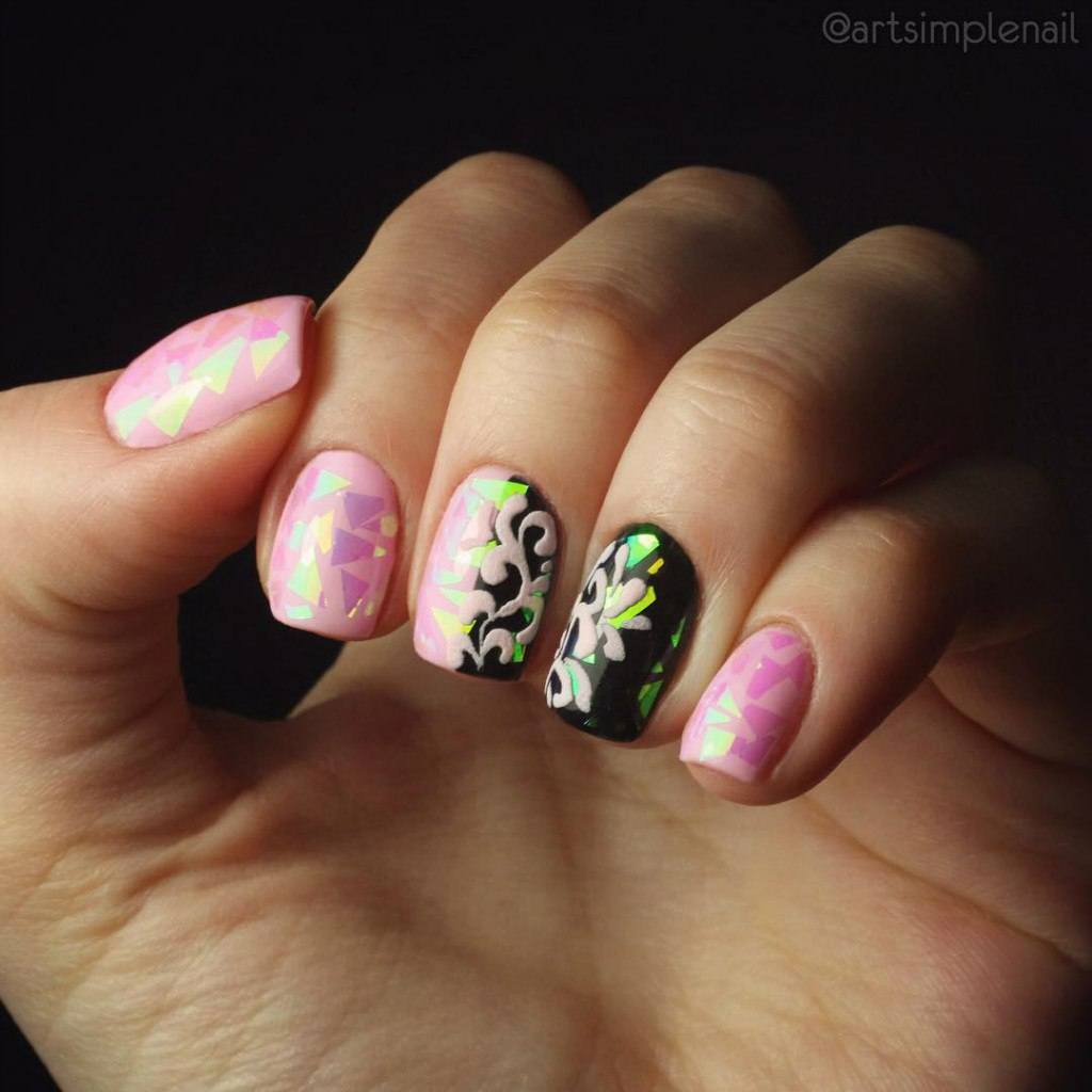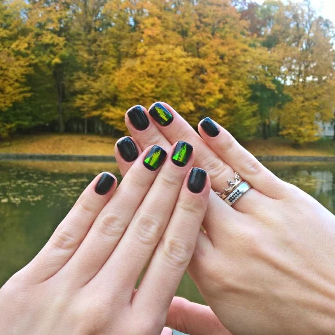 Pour la manucure, appelée «verre brisé», on utilise un film holographique spécial dont des morceaux sont appliqués sur la plaque à ongles. La lumière incidente sur ces pièces est réfractée, créant un débordement spectaculaire et un jeu de couleurs sur les ongles, qui ne peuvent tout simplement pas vous laisser sans surveillance.