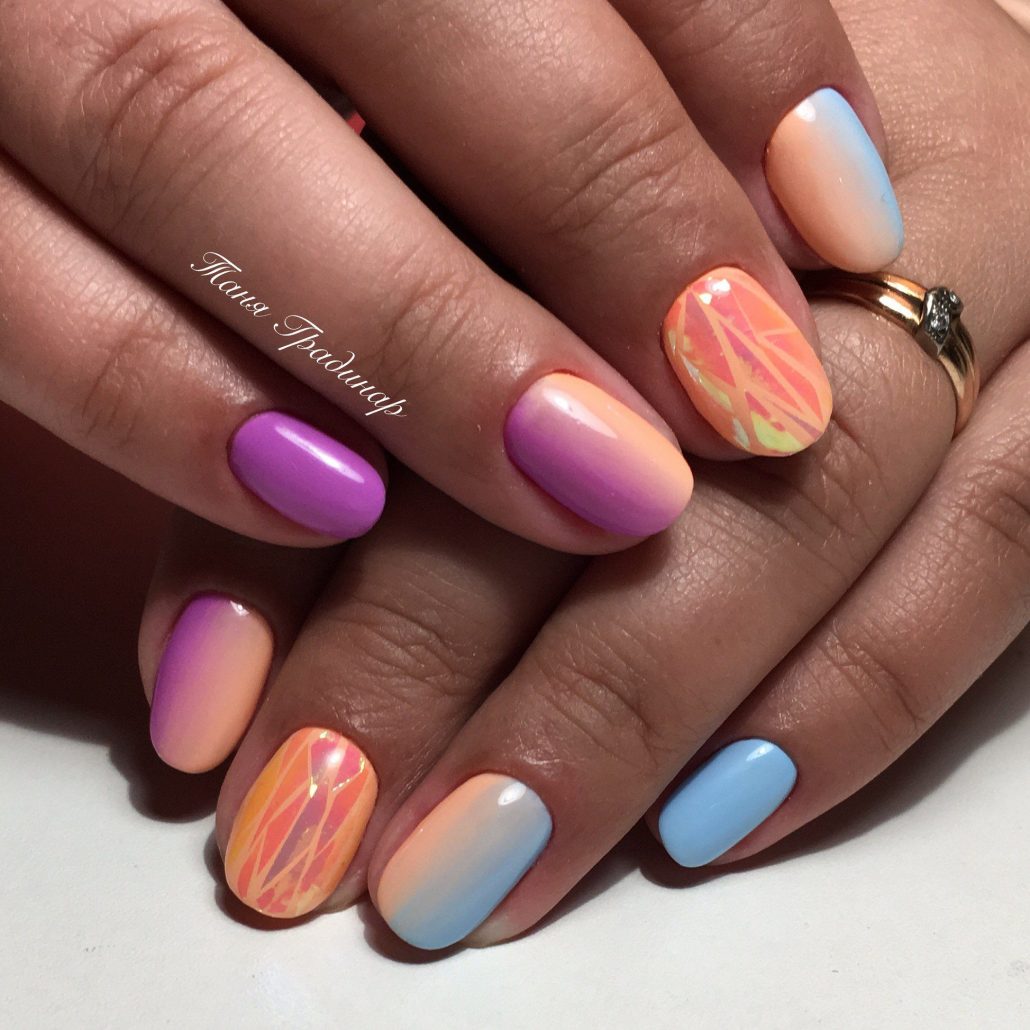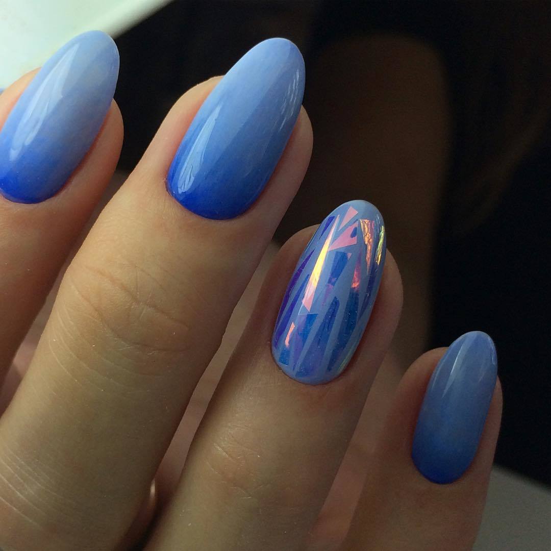 Les fragments seront attrayants sur une manucure à gradient. Dans ce cas, il est recommandé d’appliquer des morceaux de film sur une zone plus sombre. De plus, plus l'ombre est profonde, plus l'éblouissement sera important.