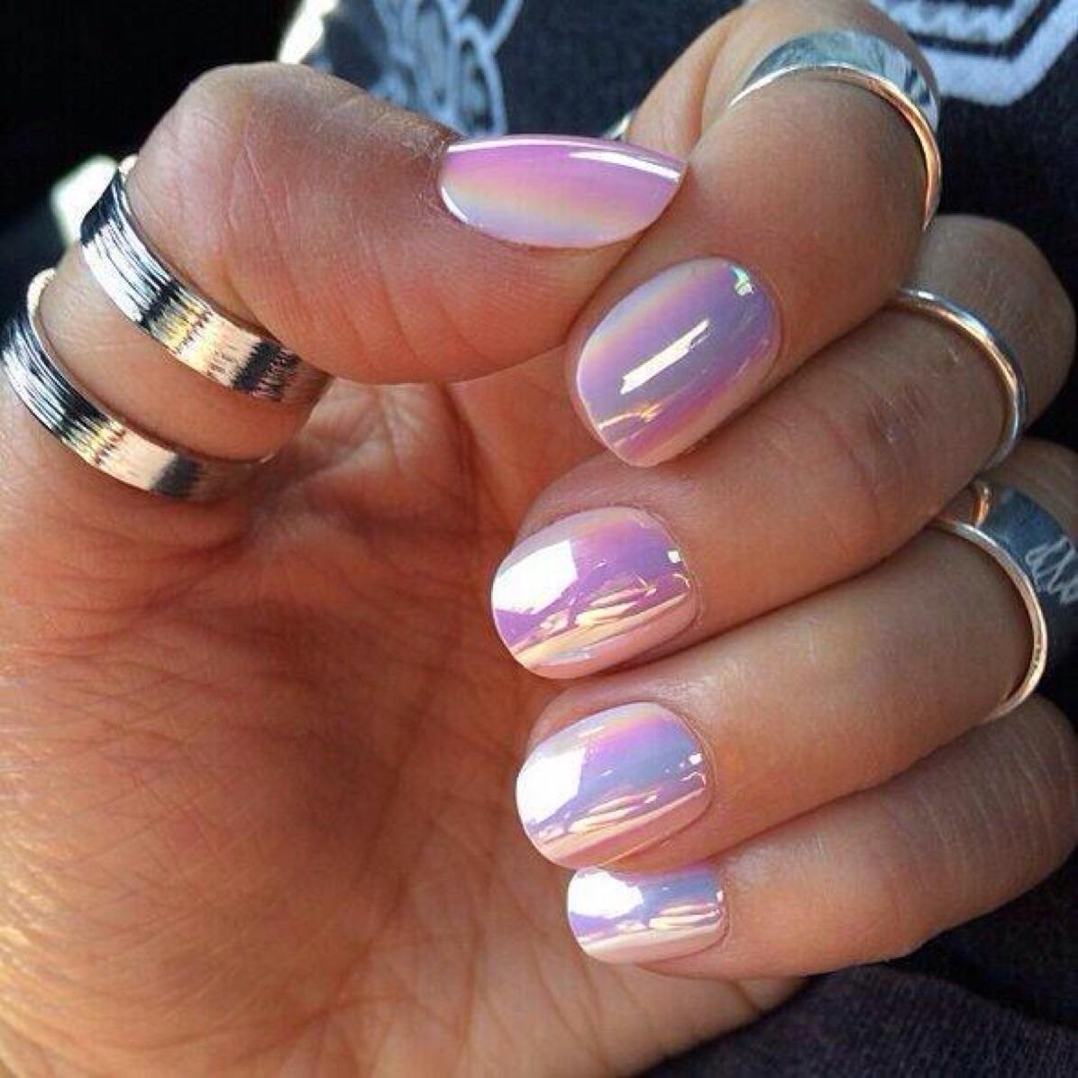 Il existe différentes options pour appliquer une feuille holographique sur l'ongle. S'il recouvre complètement toute la plaque à ongles, alors elle aura l'air lisse et ressemblera à un miroir. En plaçant ses pièces en couches, vous obtiendrez un effet de débordement coloré. Et l'utilisation de "fragments" individuels vous permet de vous concentrer sur les stylos féminins.