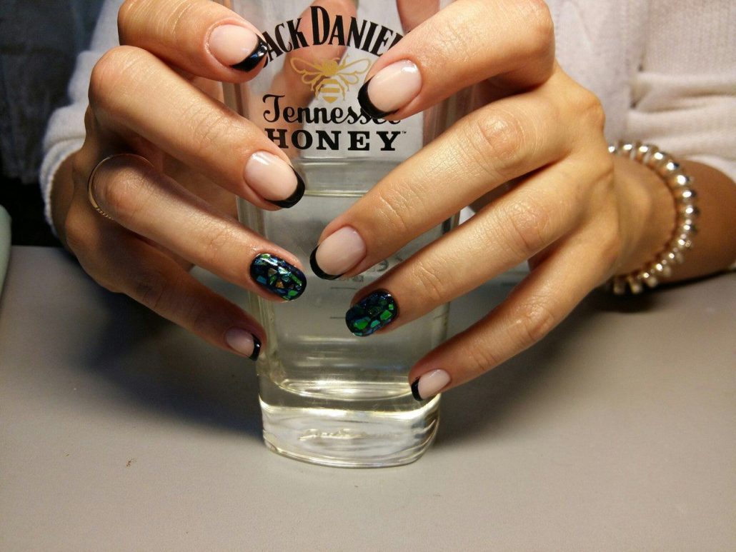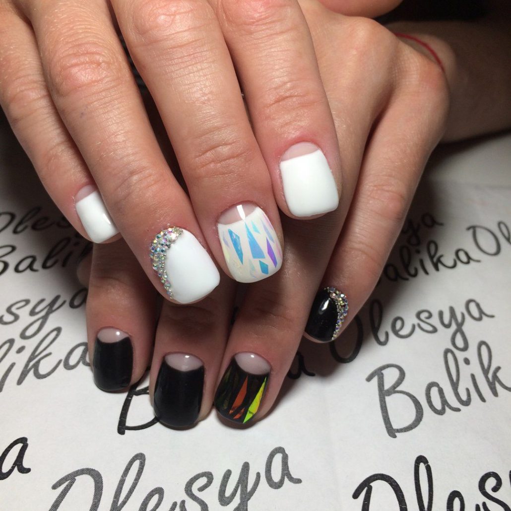 Cela va bien avec manucure au clair de lune. Comme une veste, du verre brisé peut être utilisé pour décorer un trou. Une manucure semble attrayante dans laquelle le trou n'est pas du tout peint ou recouvert d'un vernis incolore, tandis que la plaque à ongles est recouverte de fragments de différentes tailles et formes. Cette conception se distingue par sa praticité, puisque la croissance de l'ongle sera complètement invisible.