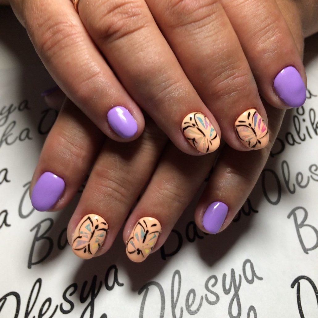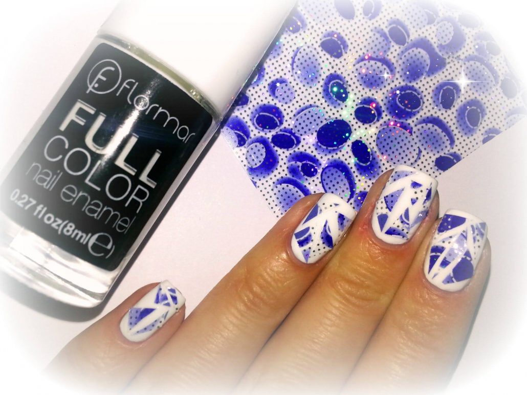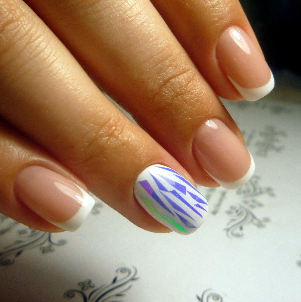 Sans attendre que la dernière couche soit sèche, à l'aide d'une pince à épiler, on applique sur l'ongle des feuilles de film préalablement préparées, qui sont disposées selon une certaine forme ou de manière aléatoire. En conclusion, une couche de finition est appliquée. Si la manucure est réalisée avec un gel lustrant, chaque couche doit être séchée sous une lampe à ultraviolets.