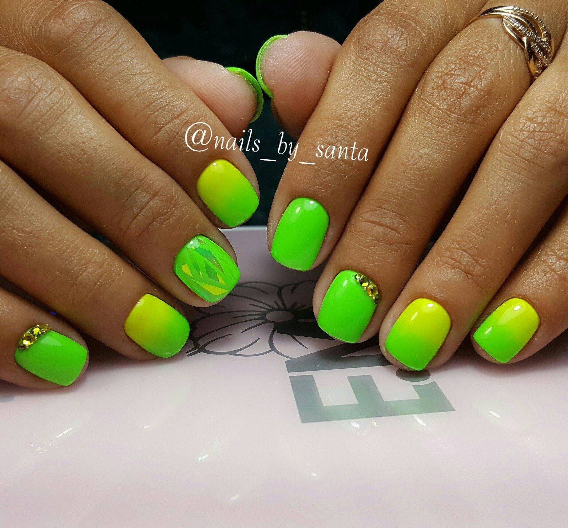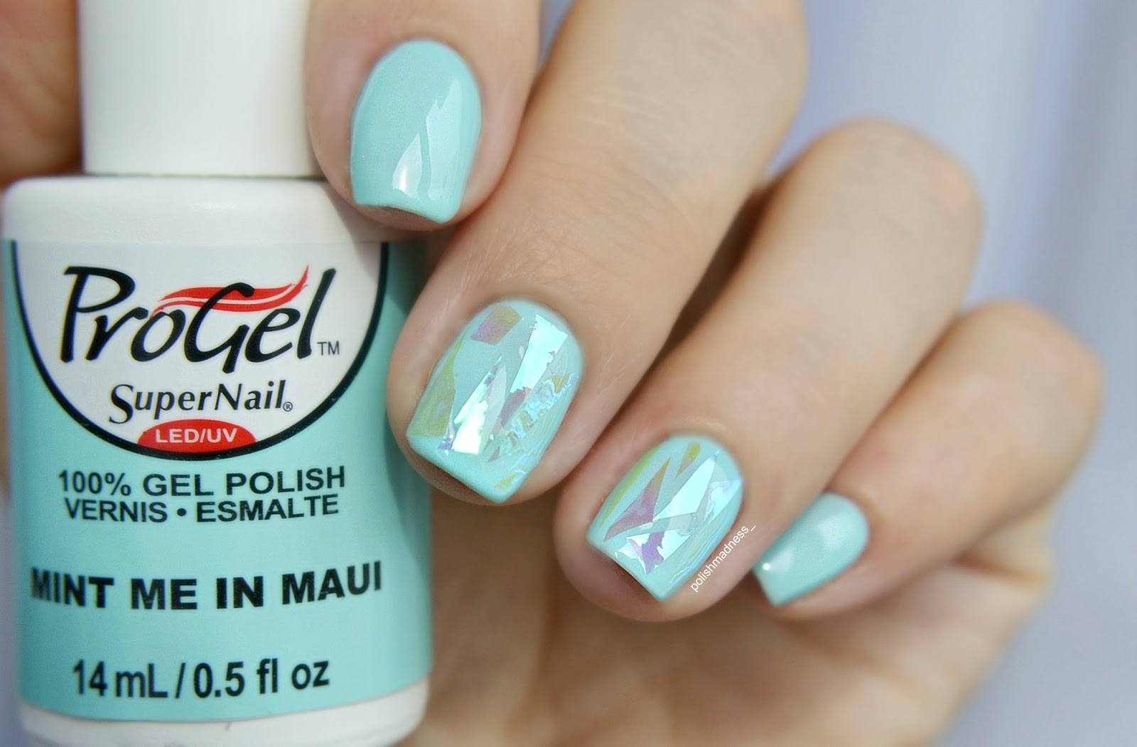 Ceux qui n'ont pas de feuille holographique peuvent utiliser du mica coloré. Une telle manucure est encore plus facile à réaliser, le mica n’ayant pas besoin d’être coupé en morceaux à l’avance. De plus, vous pouvez acheter des autocollants holographiques spéciaux, ce qui accélérera le processus de manucure. Dans les cas extrêmes, vous pouvez utiliser des strass de forme irrégulière, le mica, qui reste d'un bouquet de fleurs ou même d'une enveloppe de chocolat.