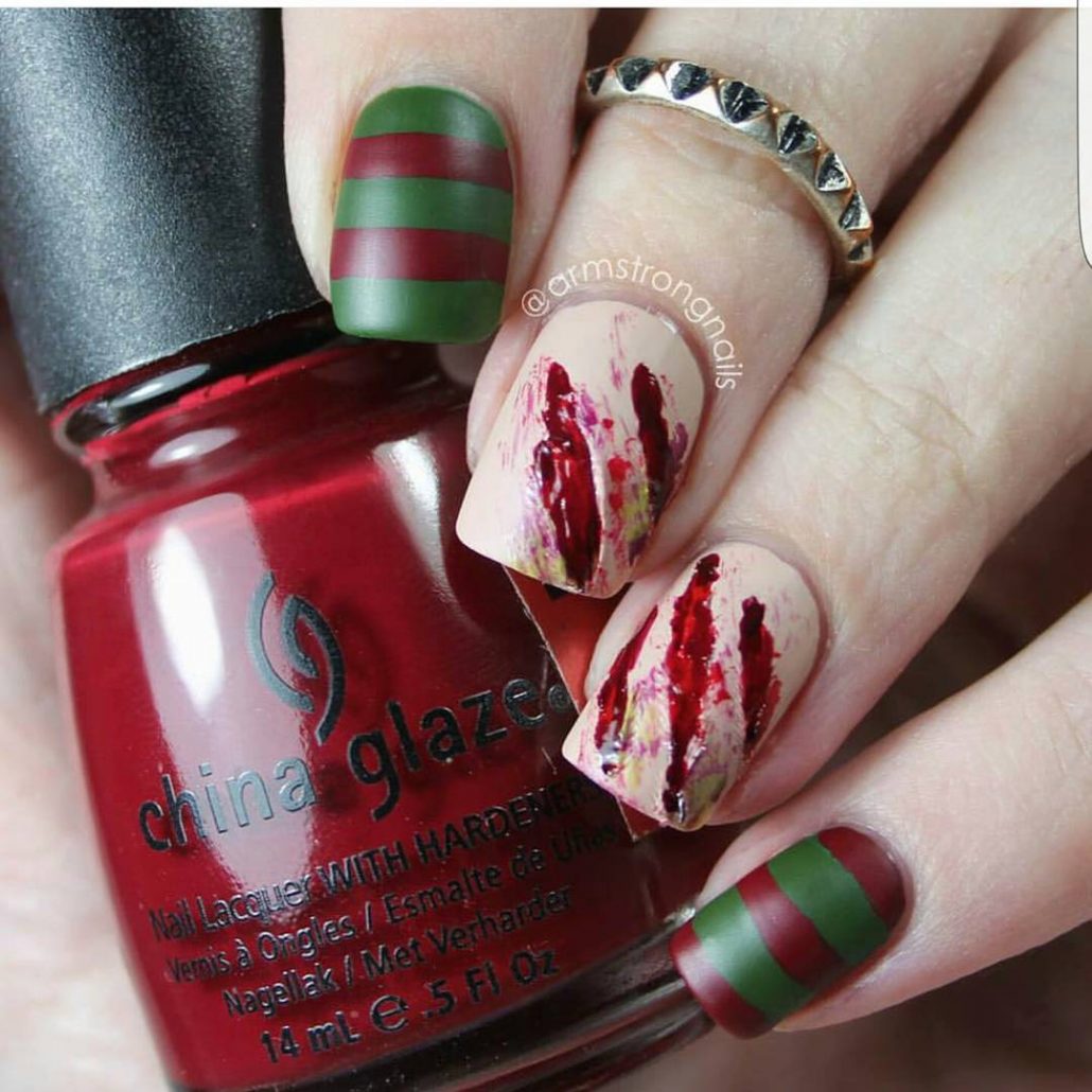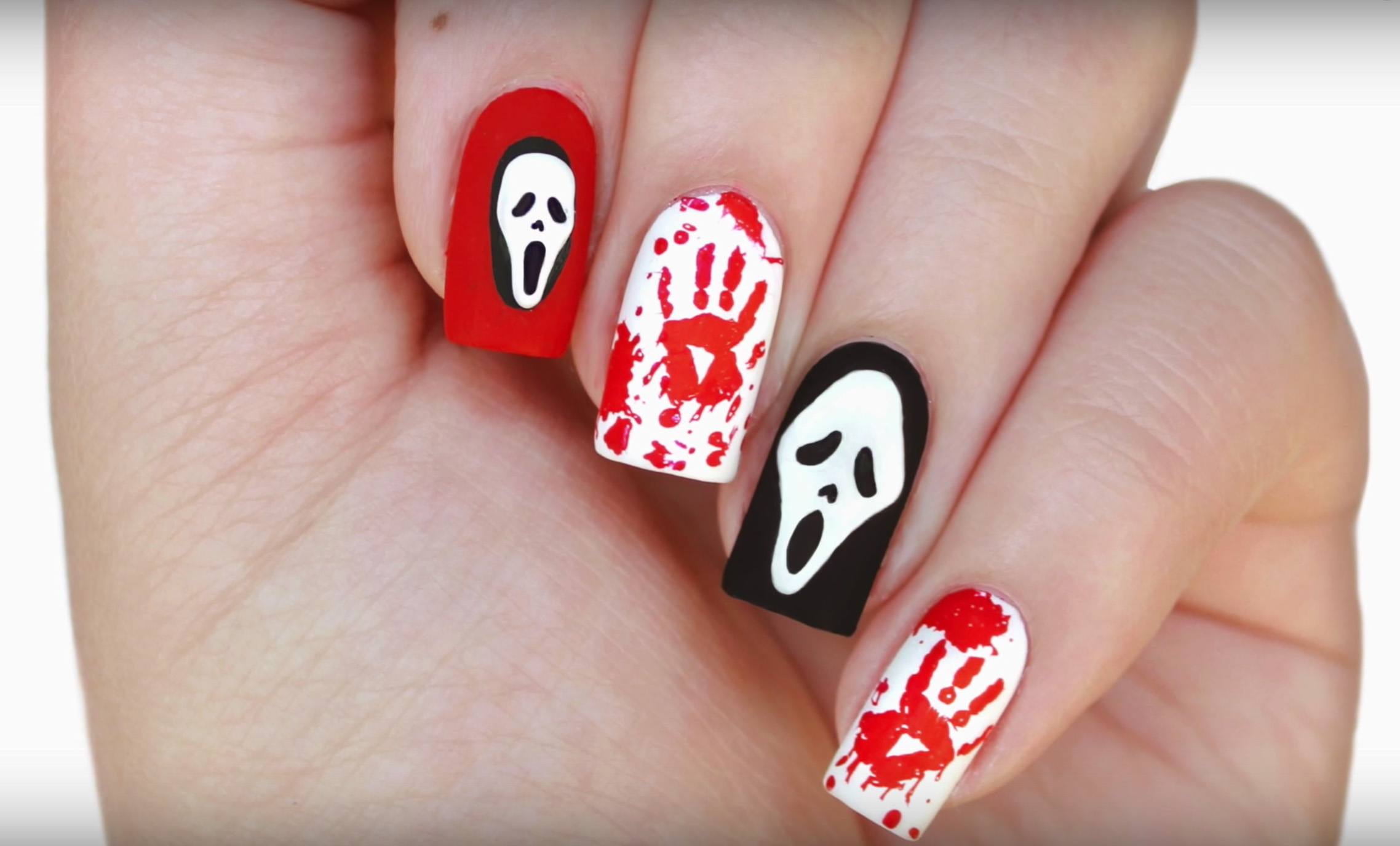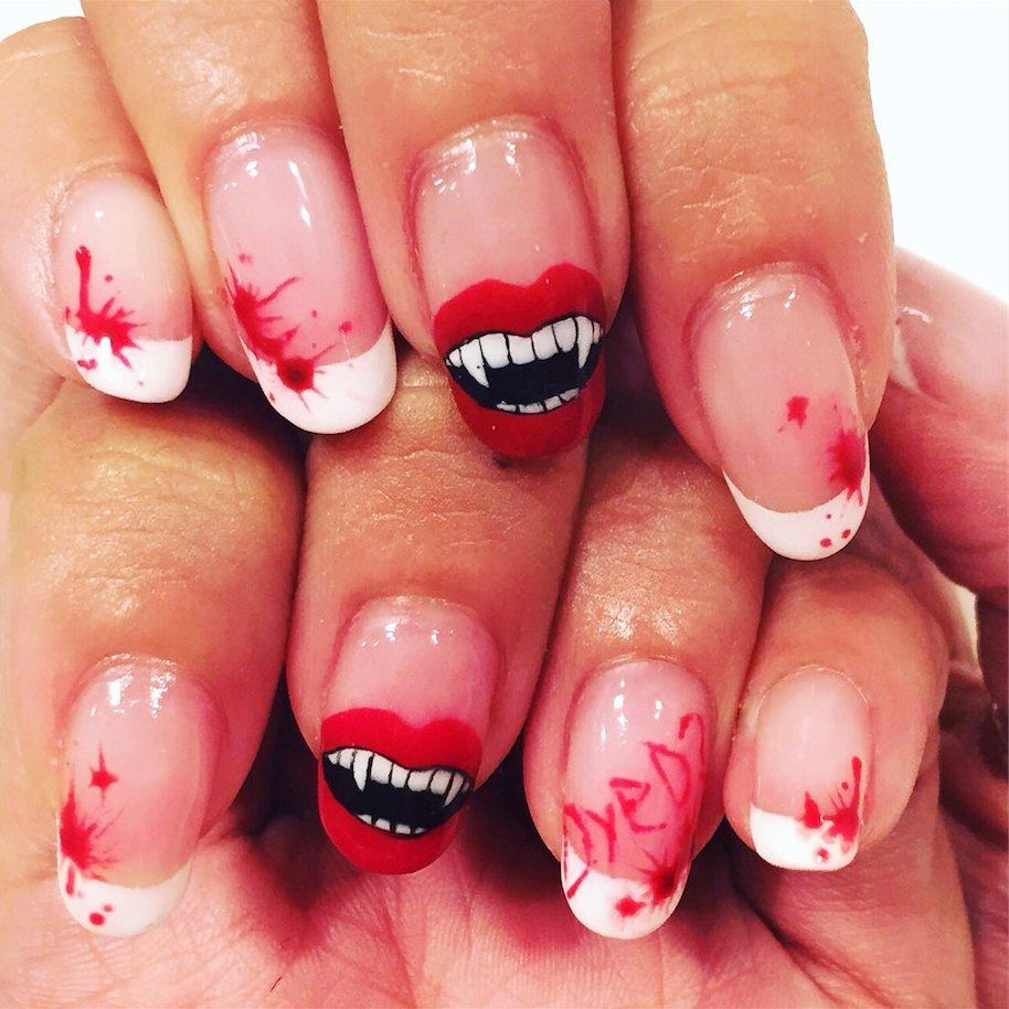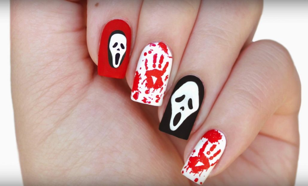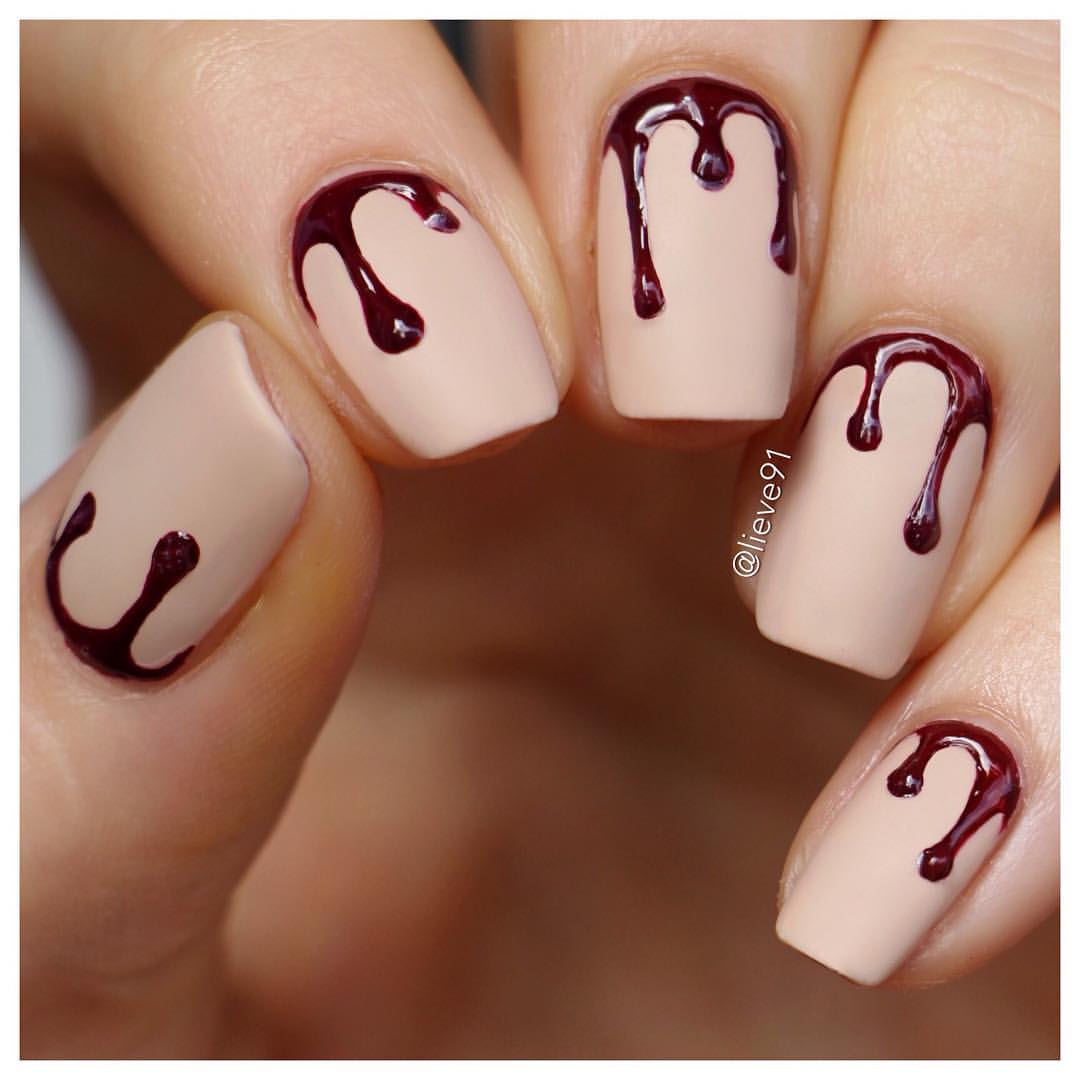 Une bonne idée serait une manucure avec l'effet de sang éclaboussé. Vous pouvez faire quelque chose comme ça vous-même. Pour ce faire, les ongles sont peints en blanc. Ensuite, une petite quantité de vernis rouge est coulée sur toute surface dure. À l'aide d'un tube à boissons dont le bord tombe dans cette flaque, une goutte de sang est appliquée sur la plaque à ongles. Pour ce faire, il suffit de souffler le vernis qui a pénétré à l'intérieur du tube sur le clou.