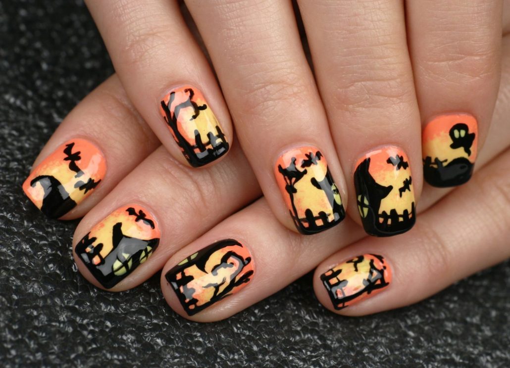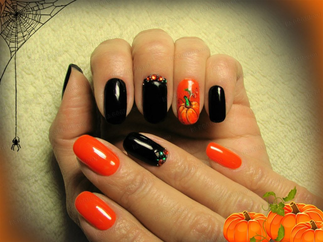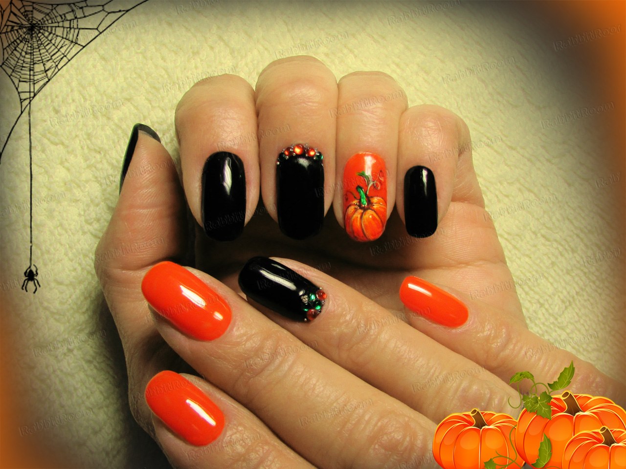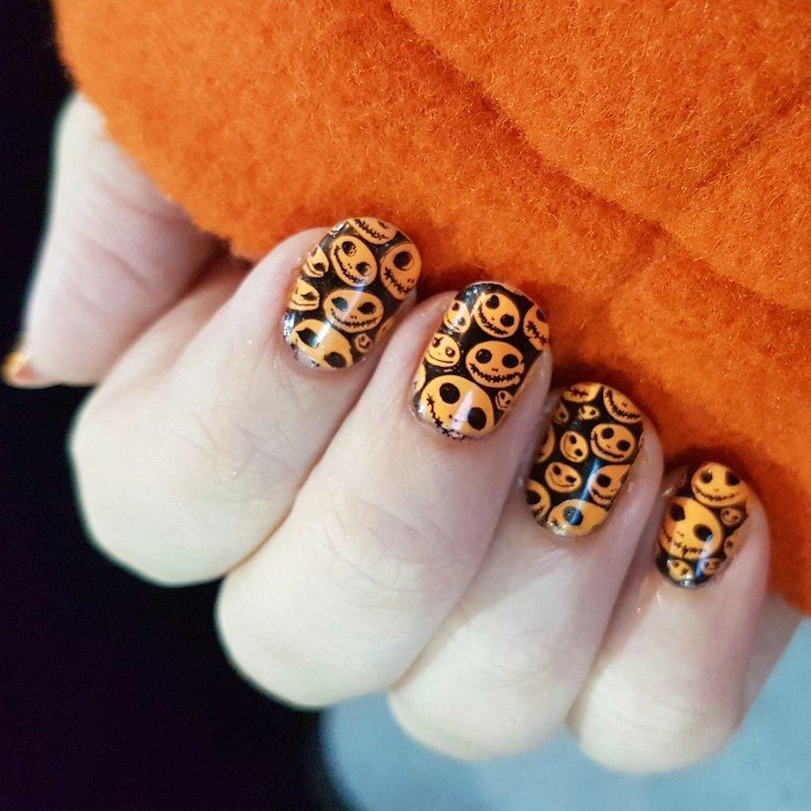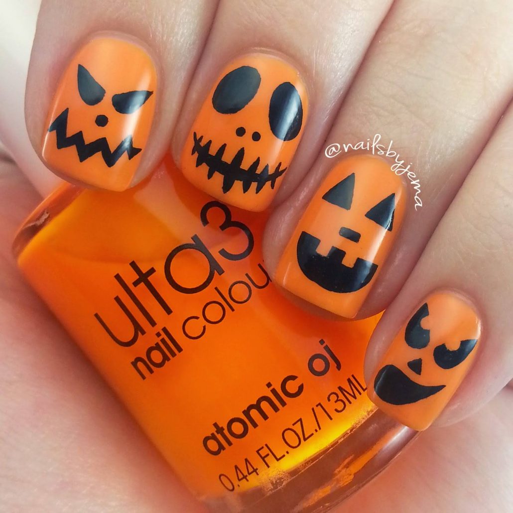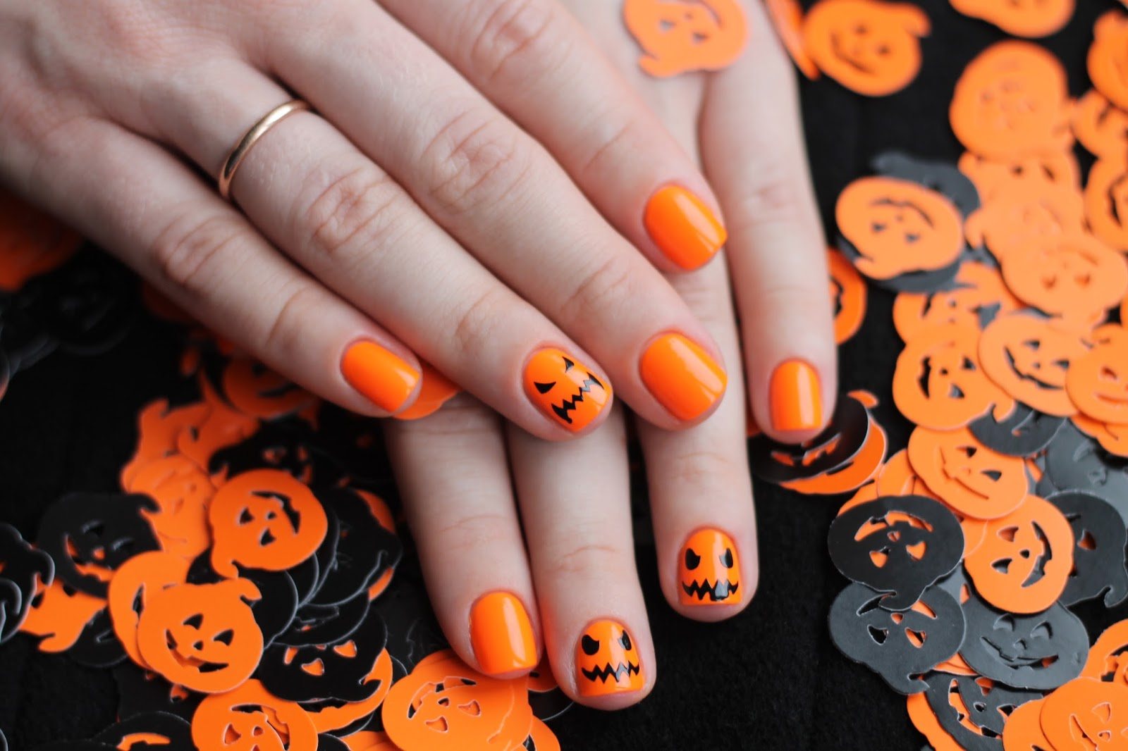 - Avec la même laque noire sur une base orange, des visages terrifiants avec un nez, des yeux et un sourire épouvantable. Ce n’est pas effrayant si elles se révèlent inégales.