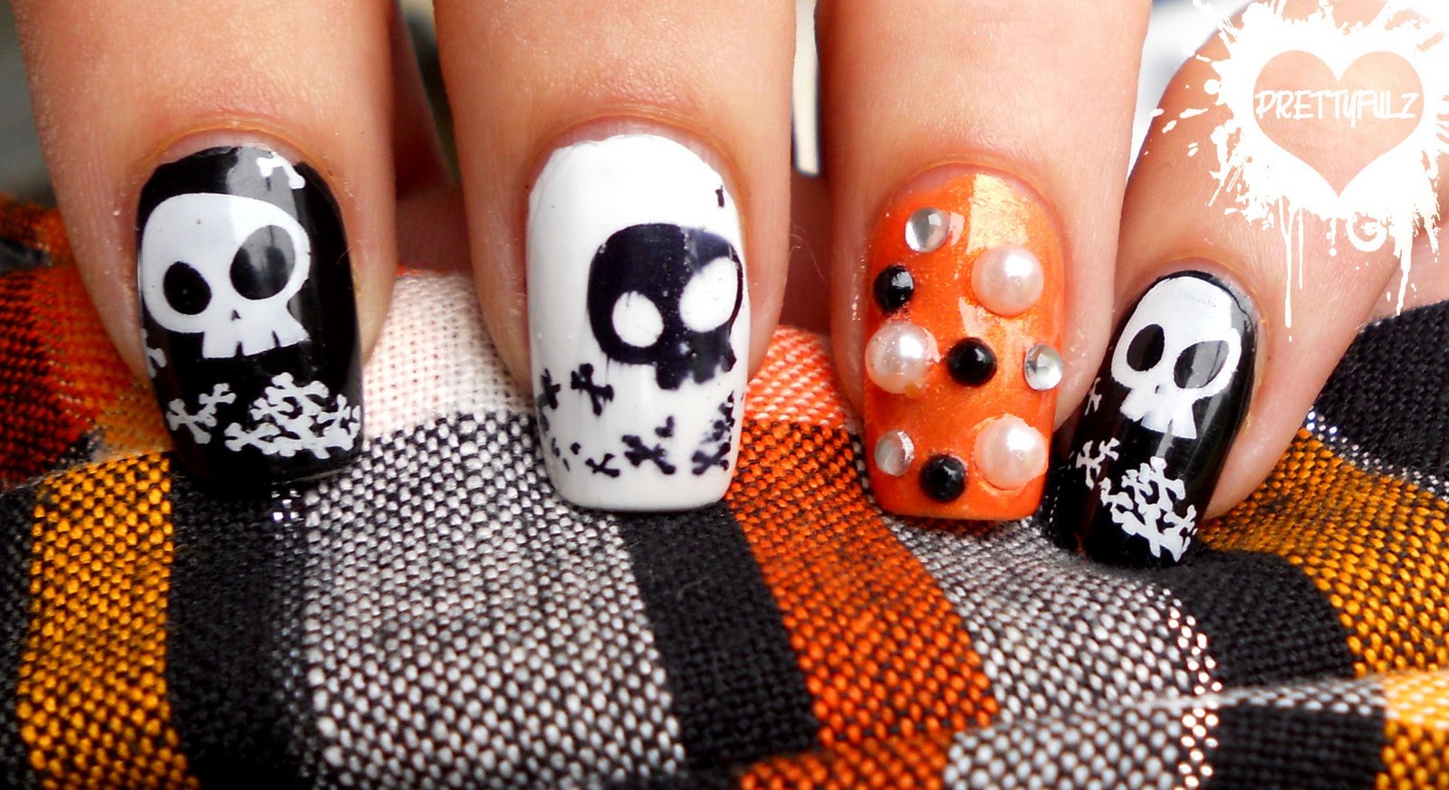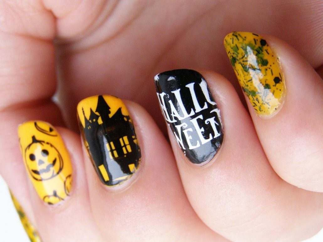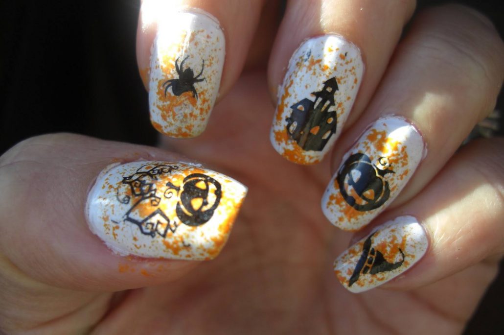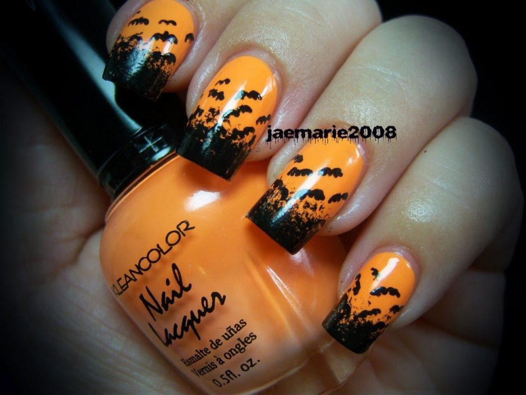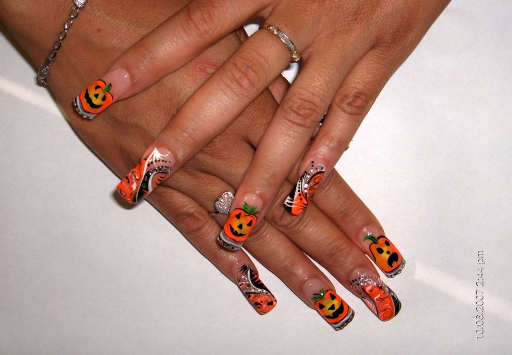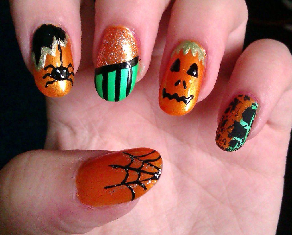 - Avec la même laque noire sur une base orange, des visages terrifiants avec un nez, des yeux et un sourire épouvantable. Ce n’est pas effrayant si elles se révèlent inégales.