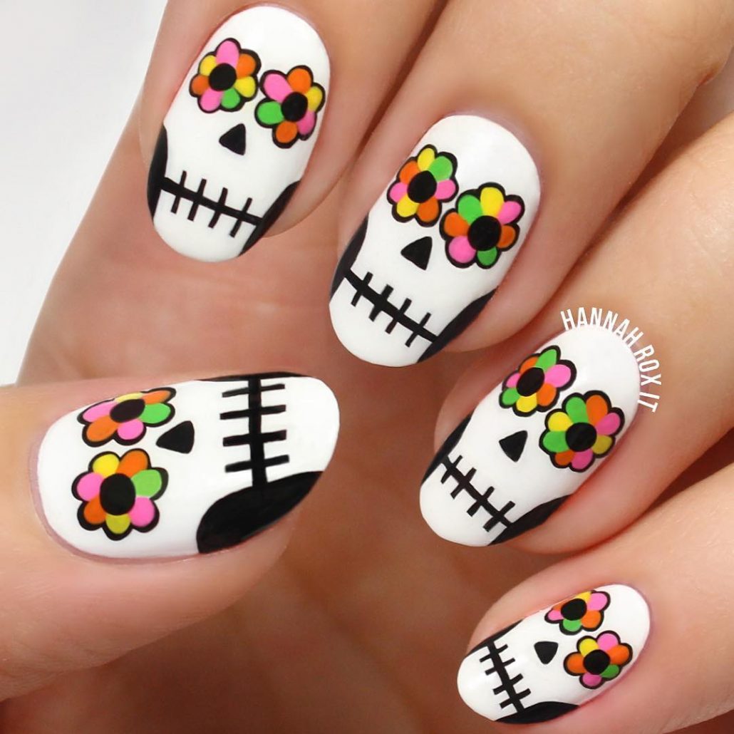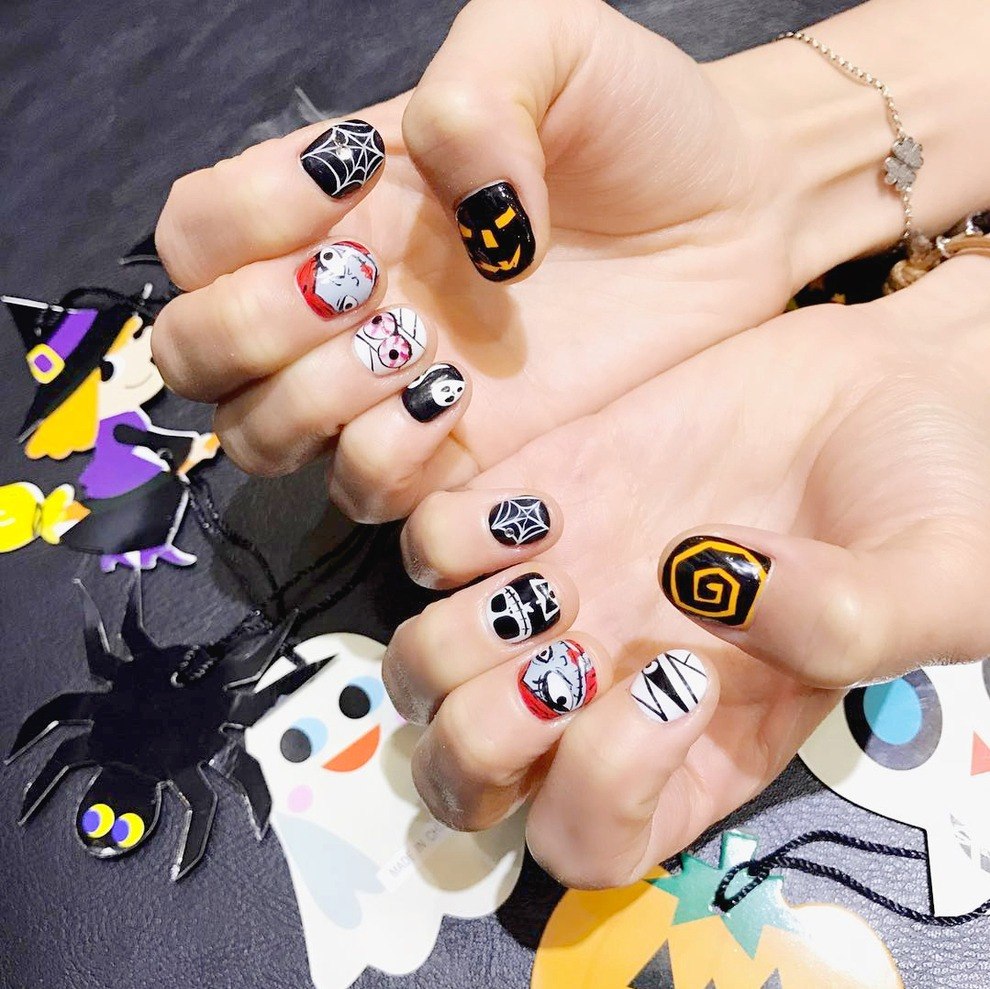 Les couleurs classiques qui composent les manucures d’Halloween sont le noir, le blanc, le rouge et l’orange. D'autres nuances peuvent être utilisées. Le plus important est qu’une image thématique appropriée s’affiche sur les ongles.