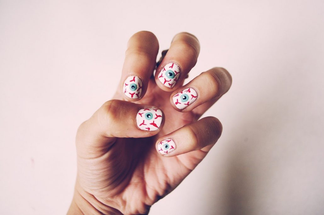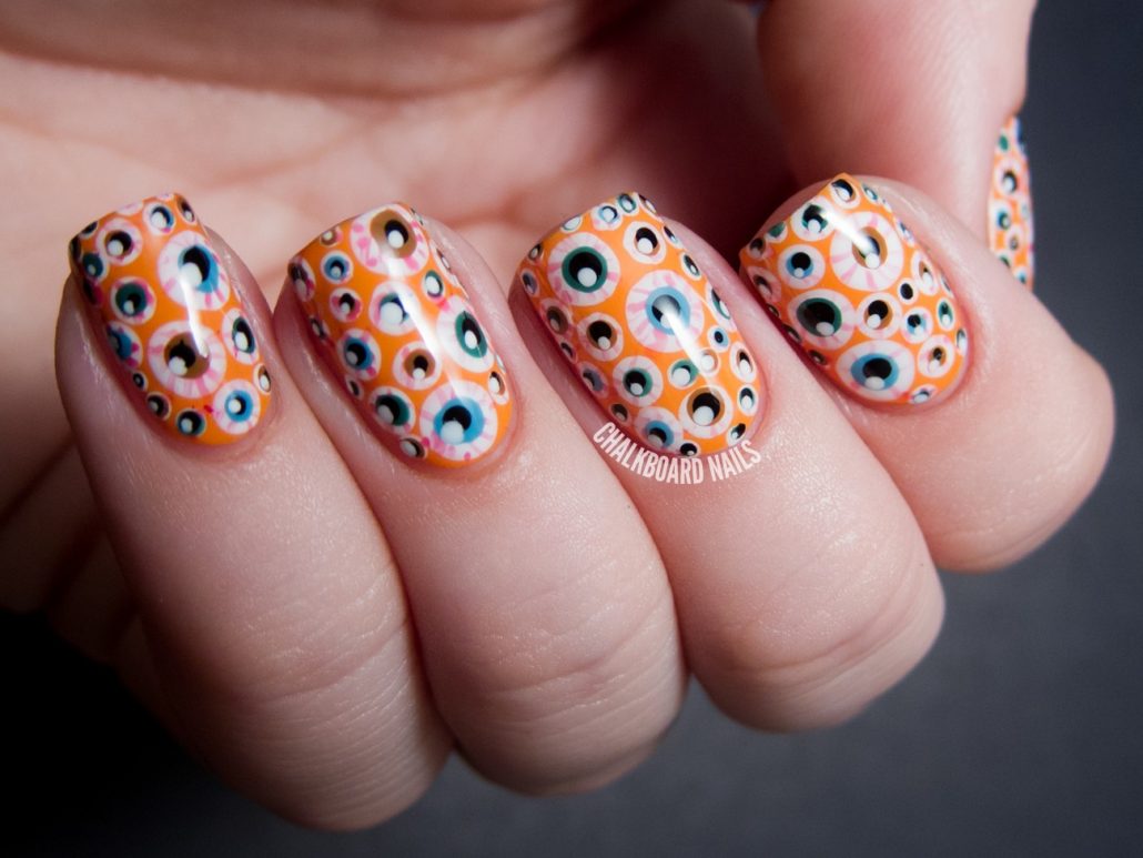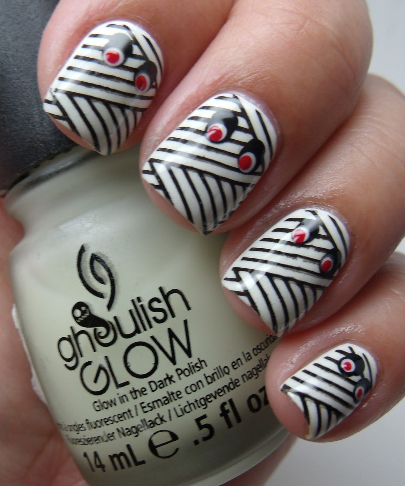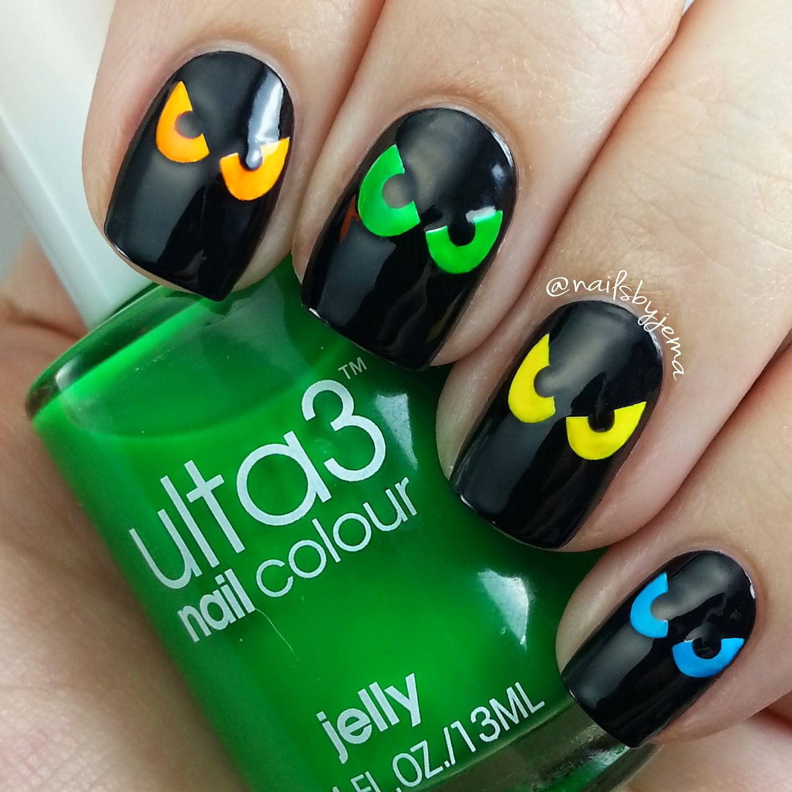 Les yeux auront l’air original et mignon sur les ongles. Faire un tel dessin est très simple, mais il a l'air élégant et approprié pour une telle fête.