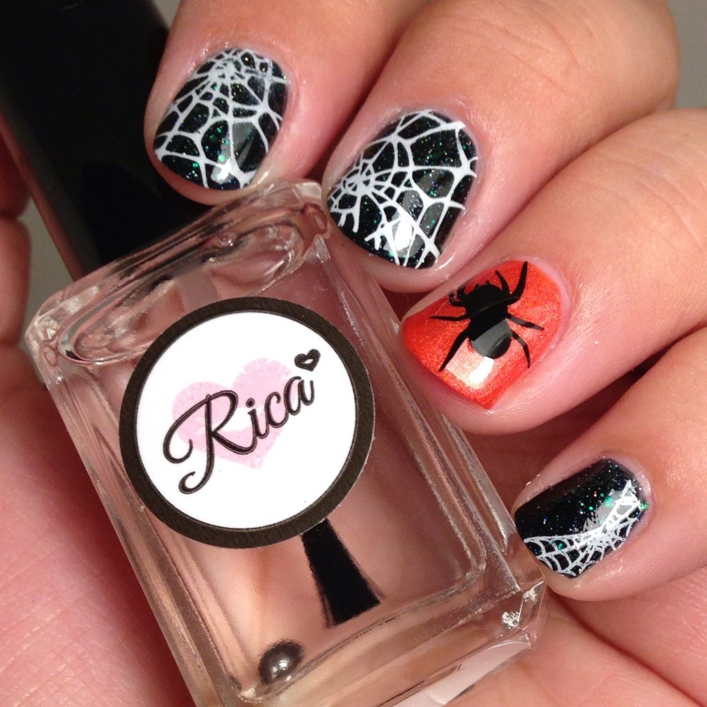 Les araignées et les toiles d'araignées sont un autre élément caractéristique des vacances. Vous pouvez les dessiner vous-même en utilisant un stylo gel classique ou des peintures acryliques noires. La toile d'araignée peut montrer sur un ou sur tous les ongles. Une telle image sera spectaculaire sur une manucure lunaire ou française.
