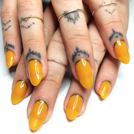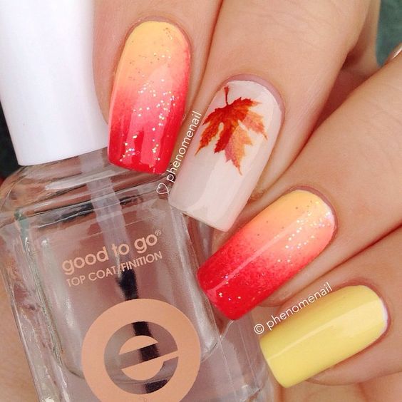 N'oubliez pas cet automne avec l'ombre sur gel-vernis, particulièrement en septembre, lorsque les fleurs estivales brillantes se transforment en des tons d'automne plus chauds. En utilisant ce design, il existe une énorme opportunité de variations avec les nuances et les couleurs. En décorant l’ombre avec des bandes de poudre acrylique ou un petit motif sur un ongle, ou en le complétant avec de petits strass, vous obtiendrez la manucure la plus en vogue de la saison.