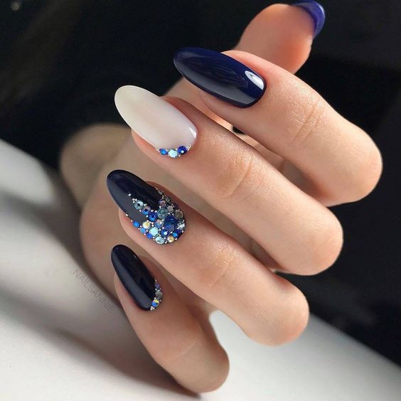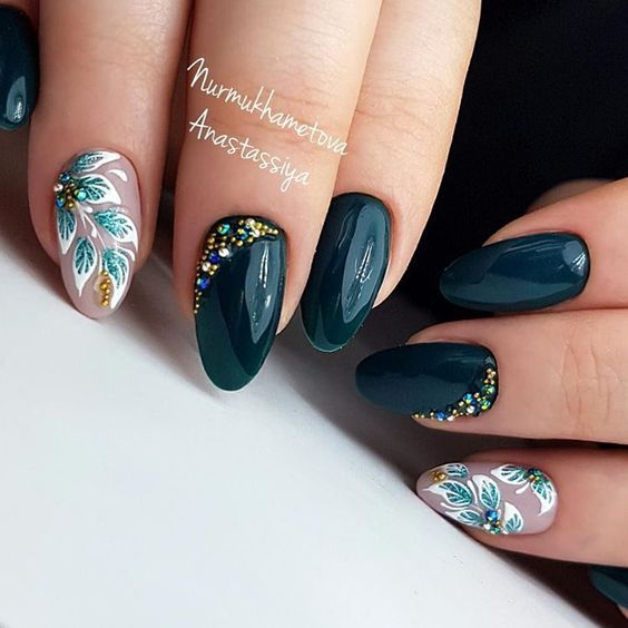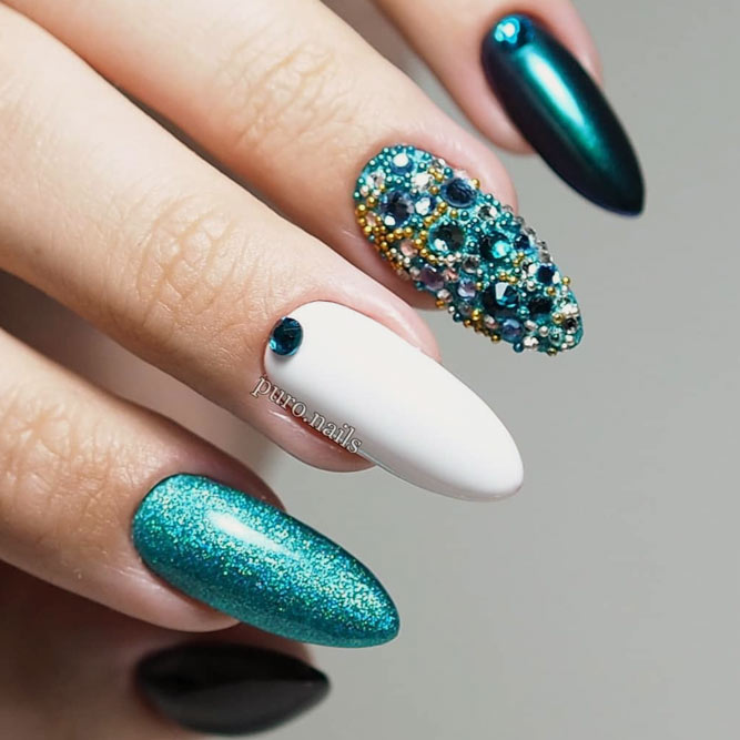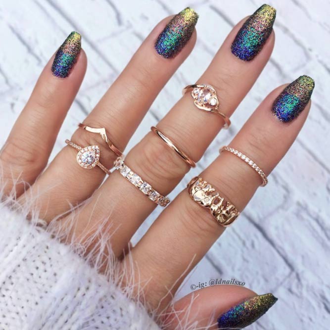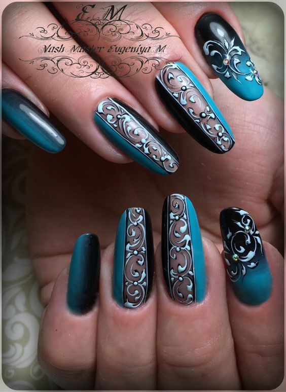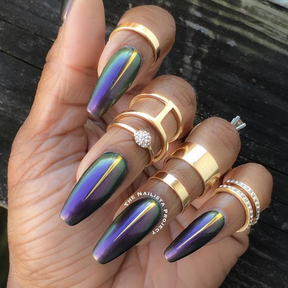 Cet automne et cet hiver, nous n'abandonnerons pas la populaire veste et manucure lunaire. Chaque année et chaque saison, de nouveaux ajouts à la conception sont ajoutés à une telle manucure. À l'automne-hiver 2026, le blouson habituel et le revers restent pertinents. Les bleus et les verts sont particulièrement populaires. Mais si vous souhaitez ajouter de la brillance et de l'originalité à une telle manucure, les éléments métalliques qui ornent la surface des ongles sont l'option la plus appropriée.