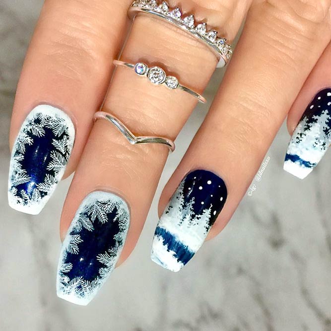 Manucure avec un ornement neigeux gagne en popularité. De tels motifs givrés semblent avantageux à la fois pour les teintes claires et sombres du vernis. Par temps froid, une manucure avec un paysage d'hiver aura fière allure. Une telle manucure deviendra encore plus efficace si la surface prend du volume avec de la poudre acrylique ou du velours. La manucure d'hiver à la mode de 2026 combine des couleurs pastel délicates et des teintes vives et saturées.