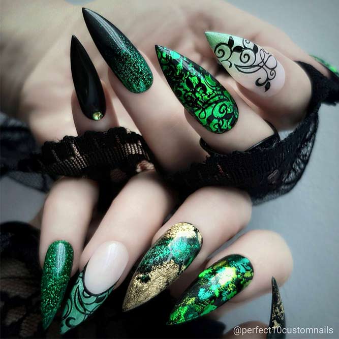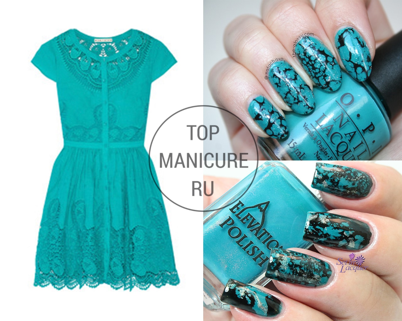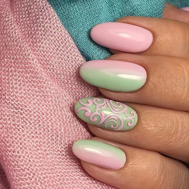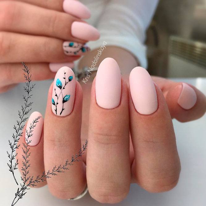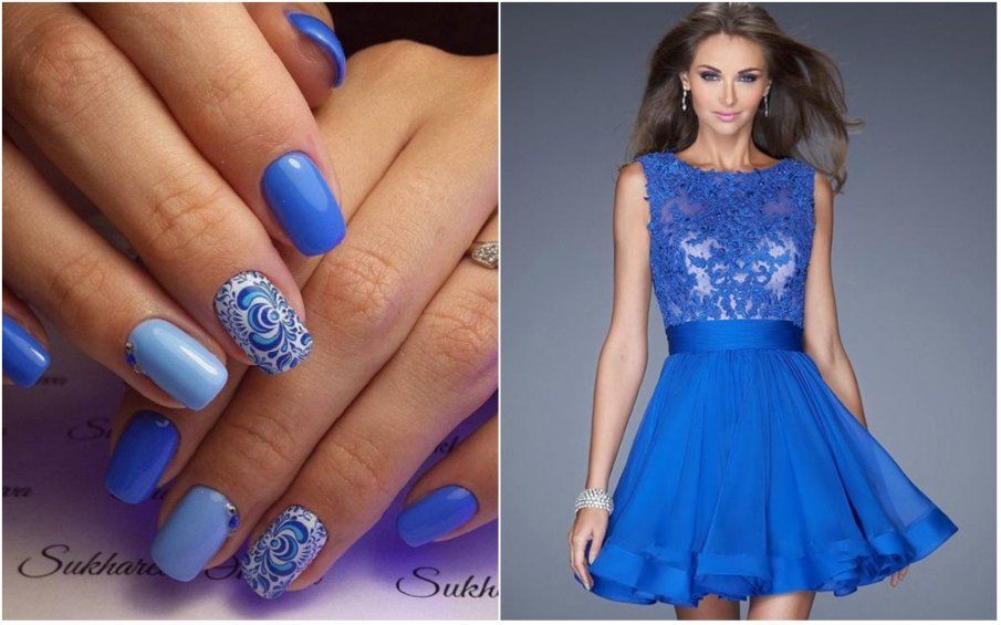 Pour une robe de couleur verte, une manucure en bleu est idéale. Un merveilleux ajout servira d'ornement sous forme de formes géométriques et de dégradés bleu-vert. De plus, les éléments roses (fleurs, rayures ou verre brisé) sur fond bleu conviennent à la nuance verte de la robe.