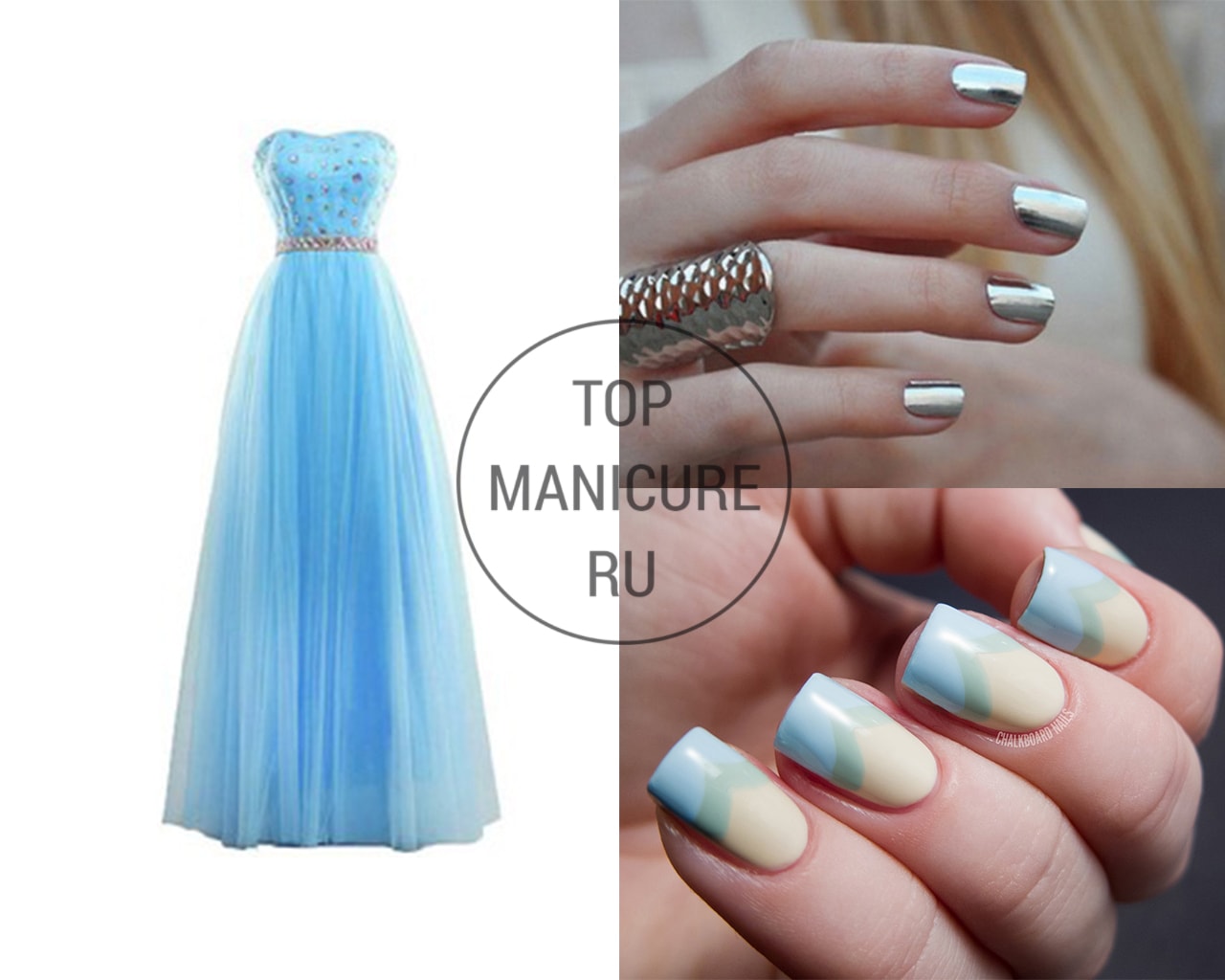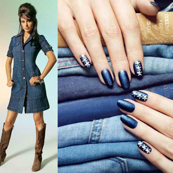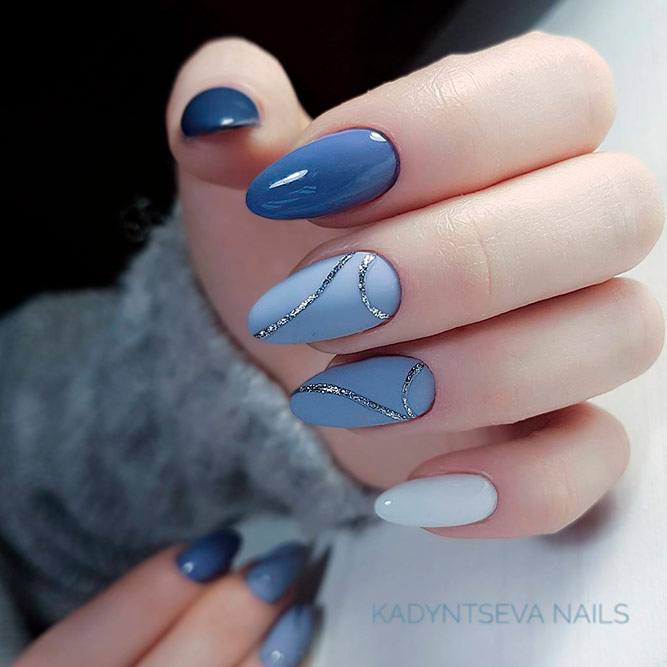 Vous pouvez utiliser des couleurs vives et neutres pour la manucure avec une robe dans une teinte bleue. De nombreux maîtres de salons professionnels pour cette couleur de garde-robe utilisent des revêtements de lit et de peau de vernis. Ce sont ces nuances qui peuvent conférer au style féminin élégance et style. Il est également à la mode d’utiliser une couleur dorée dans une manucure, surtout si vous utilisez le trou dans la direction opposée.