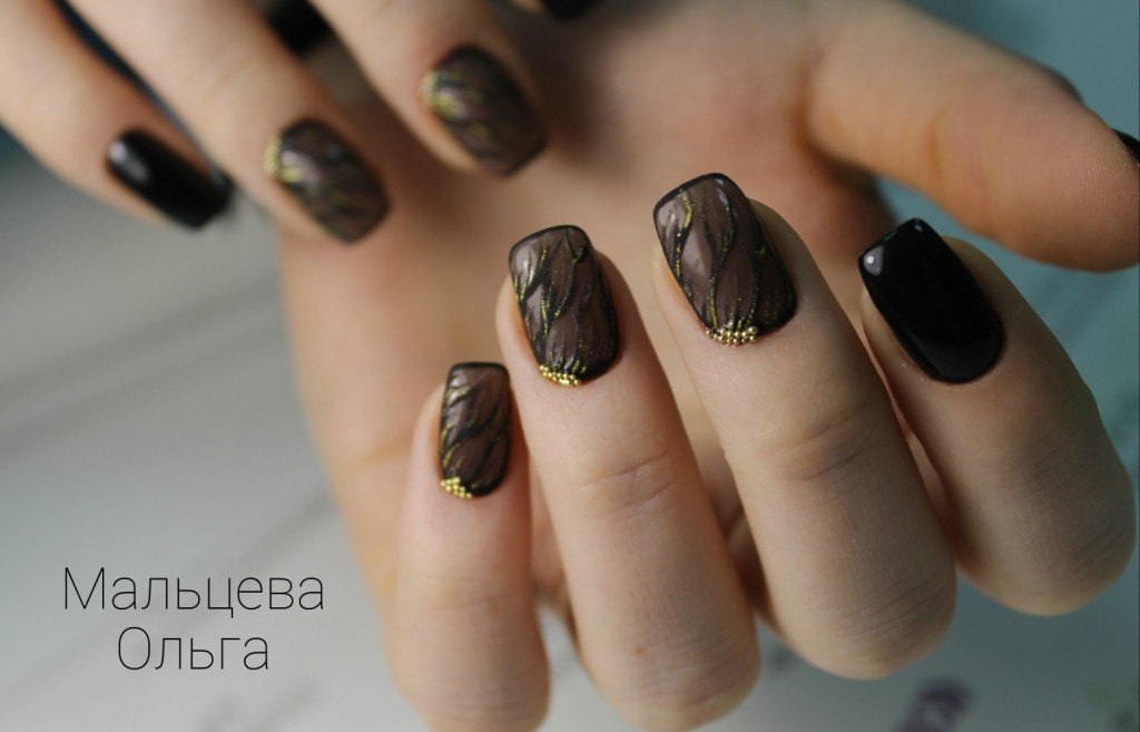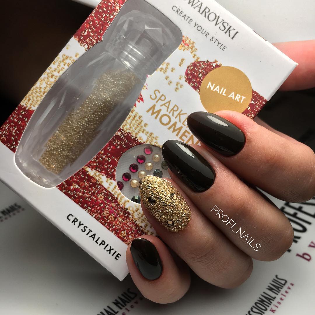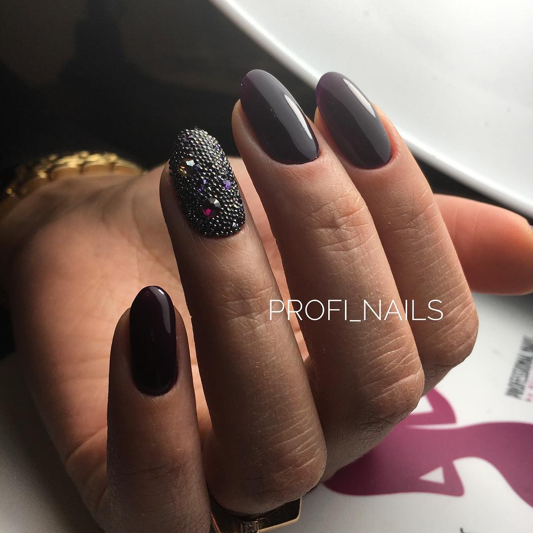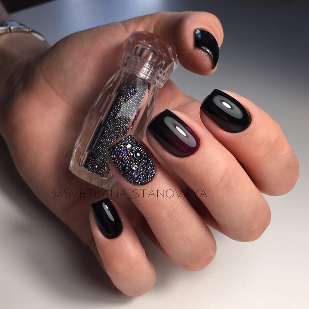 Les nuances noires de bouillons sont une excellente décoration pour une manucure solennelle et le soir. Grâce aux capacités de conception, toute fille ou femme peut donner à sa soirée un air noble et choquant. De nombreux maîtres en manucure préfèrent que les bouillons noirs ne soient pas recouverts d'un agent fixant. Cela est dû au fait que le plateau pourra noyer l'éclat d'une manucure chic et que les petits cailloux irisés perdront leur belle apparence.