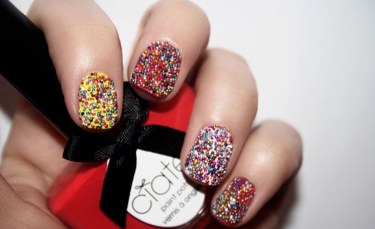 Les bouillons sont appelés plutôt petites boules faites de couleurs différentes. En apparence, les petites particules rondes ressemblent au caviar de poisson. Parmi les maîtres de la manucure, une conception avec l'ajout de ce bijou s'appelle «manucure au caviar». En ce qui concerne la coloration des bouillons, leurs nuances sont très diverses. Et en manucure, ils ont également un aspect différent. Par exemple, les «œufs» rouges et noirs donneront aux ongles un aspect plutôt riche et noble. La conception des ongles avec des bouillons est considérée comme assez abordable et simple. Presque toutes les filles pourront décorer leurs ongles avec de petites boules à la maison, l’essentiel est de rêver un peu et tout ira bien.