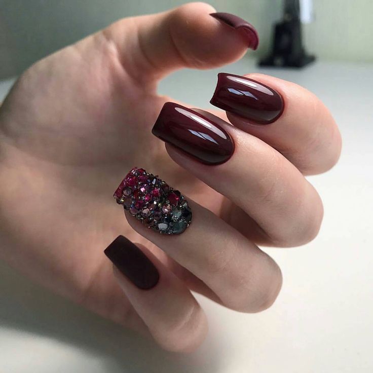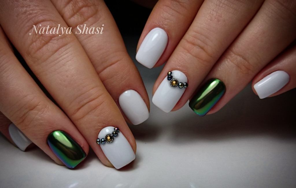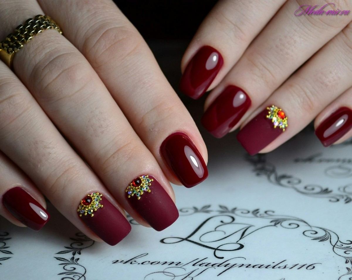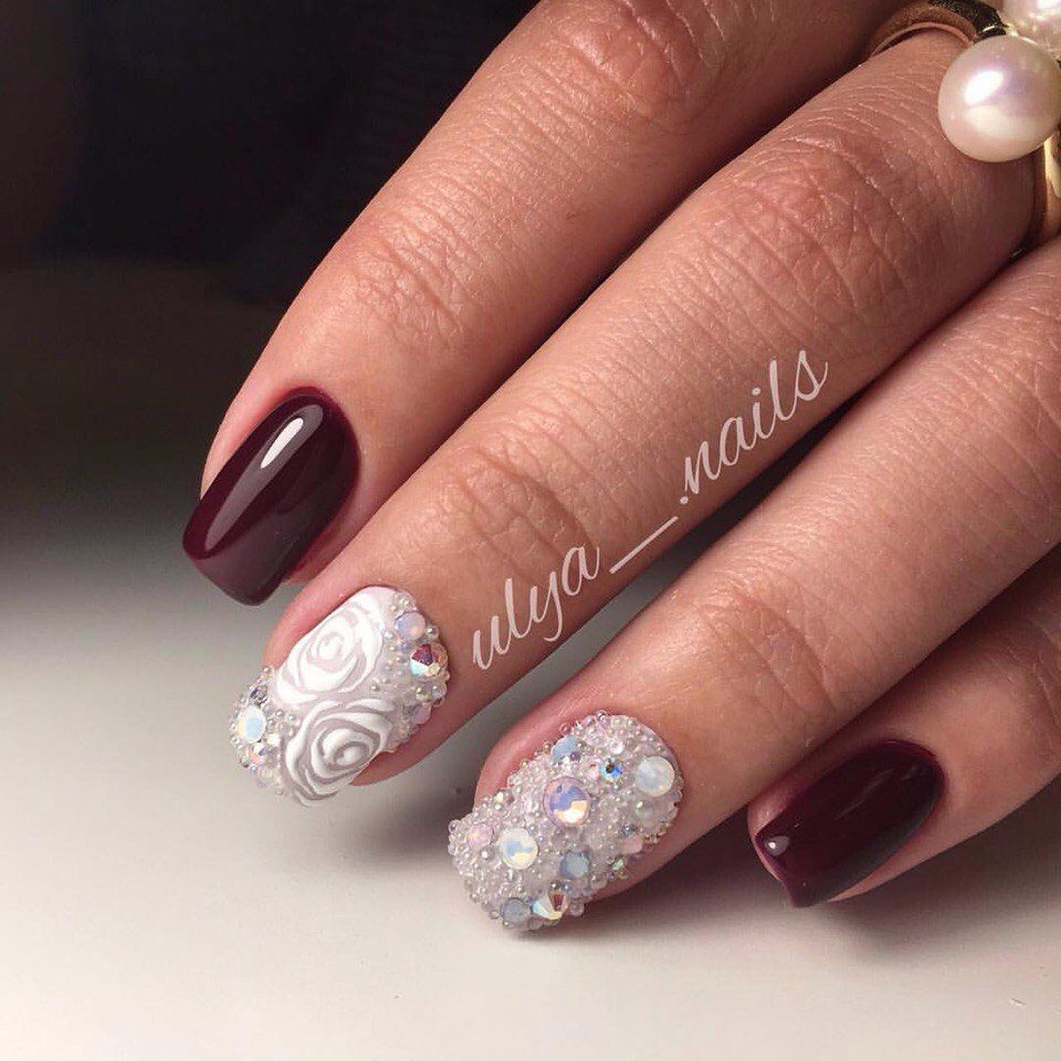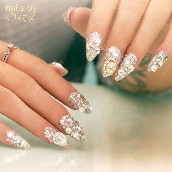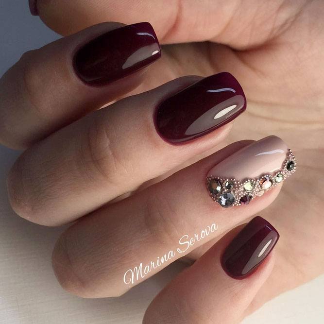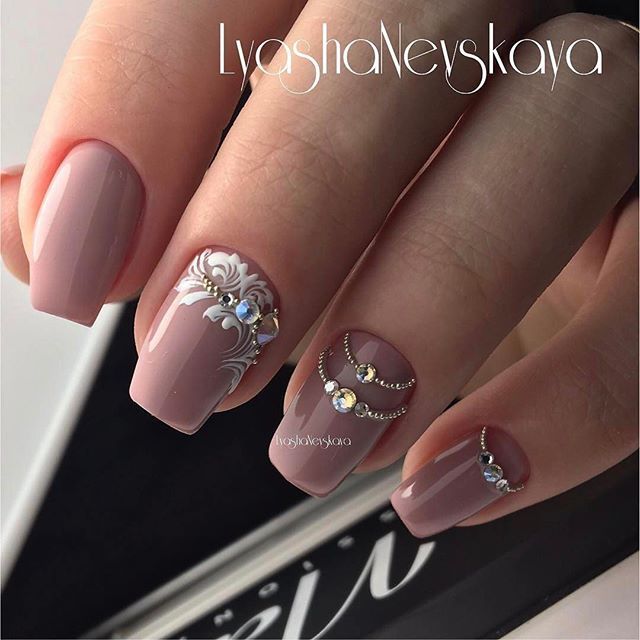 Il existe de nombreux bijoux de manucure intéressants qui se marient parfaitement avec des bouillons. Un exemple est strass. Avec leur aide, vous pouvez créer une variété d'ornements: des fleurs, des lignes, des coins et de nombreux autres dessins. Une manucure avec bouillons et strass semble assez originale et riche. Tout dépend du professionnalisme et de l'imagination du maître.