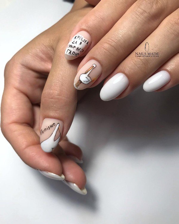En fait, le choix des inscriptions ne se limite pas à des citations et à des phrases de motivation. N'ayez pas peur d'être drôle, amusant et montrez à chacun votre sens de l'humour. N'hésitez pas à faire une manucure sophistiquée avec des personnages de dessins animés et des inscriptions amusantes. Après tout, il va vous remonter le moral et vous faire sourire à nouveau.