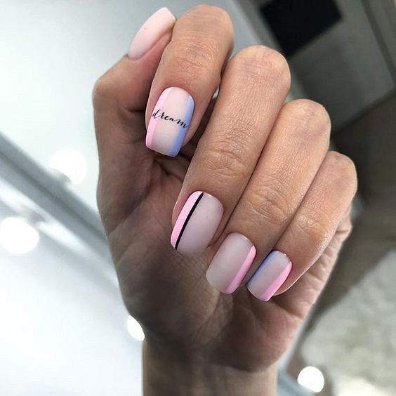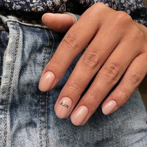 Malgré toute la variété des polices et des inscriptions, beaucoup de gens aiment le minimalisme beaucoup plus. C’est une excellente option pour toutes les occasions, du travail au soir. Comme vous le savez, la beauté est dans la simplicité. Par conséquent, faites audacieusement un revêtement simple avec une petite phrase belle ou un mot. Dans ce cas, il est préférable de choisir des tons neutres tels que le beige, le noir, le blanc, le gris ou le bleu. L'inscription peut être faite indépendamment ou utiliser des autocollants spéciaux. Cette conception a toujours l’air particulièrement belle et moderne, quelles que soient la longueur et la forme des ongles.