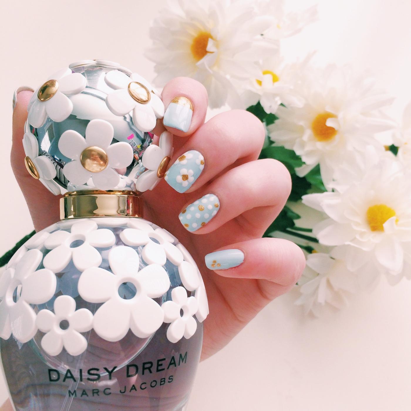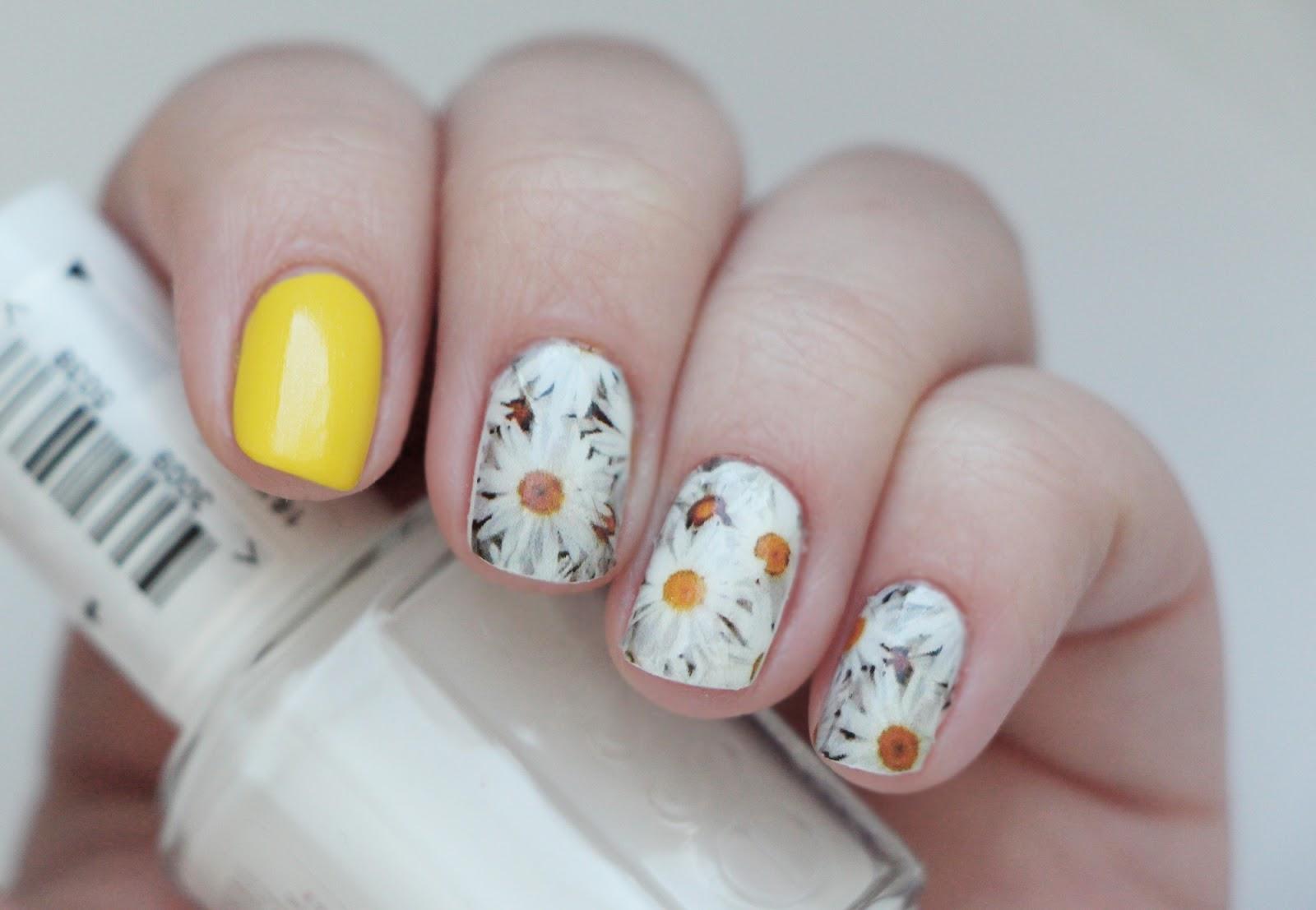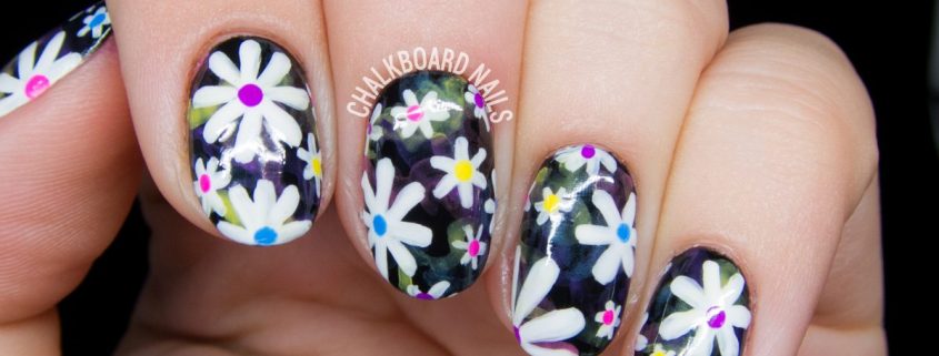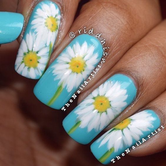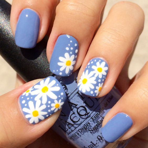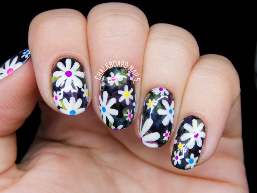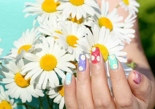 Manucure avec marguerites et motifs géométriques.