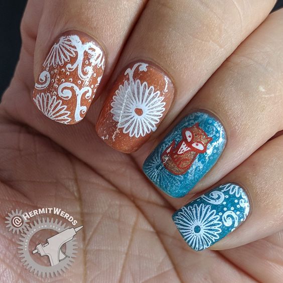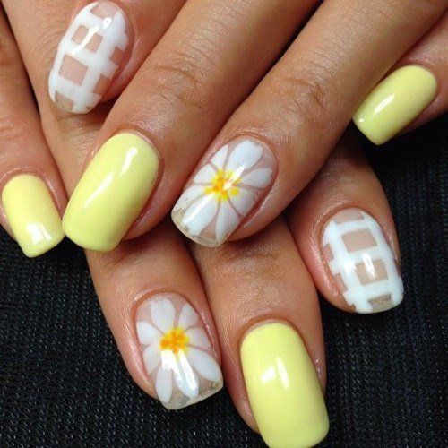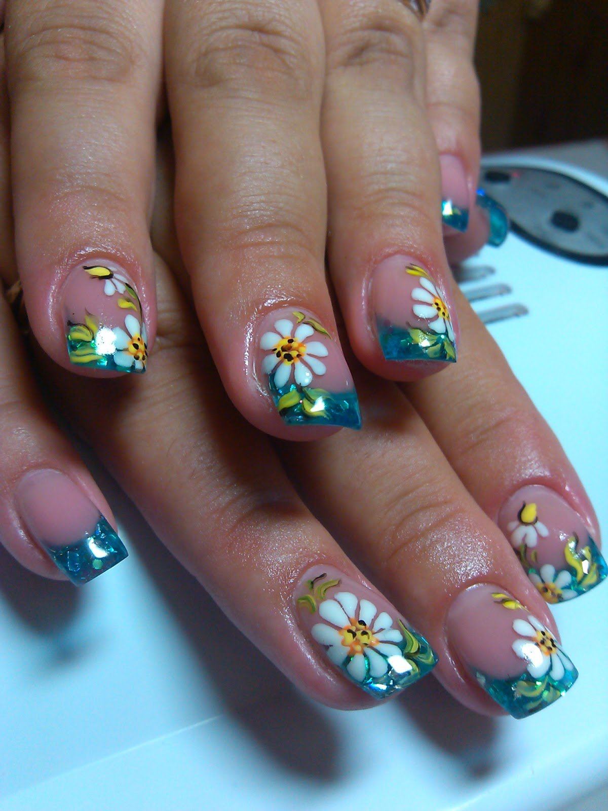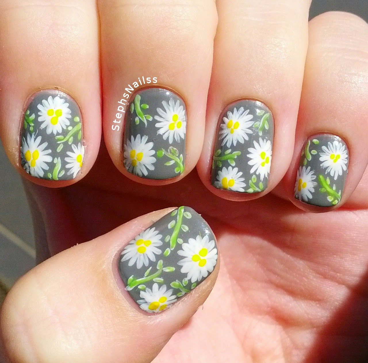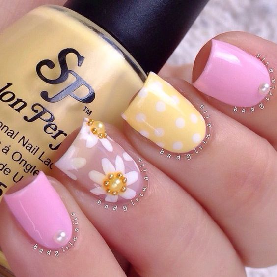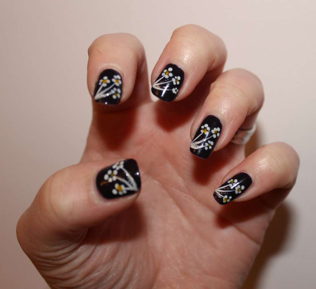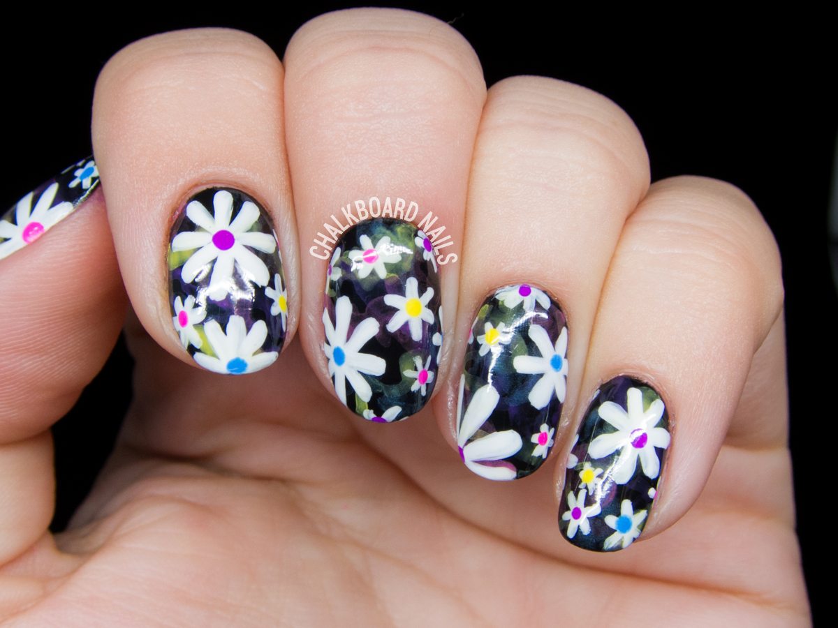 Manucure avec marguerites et motifs géométriques.