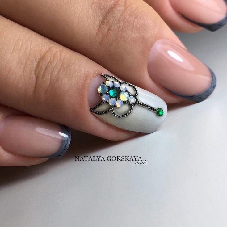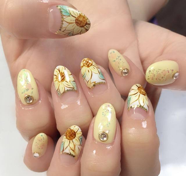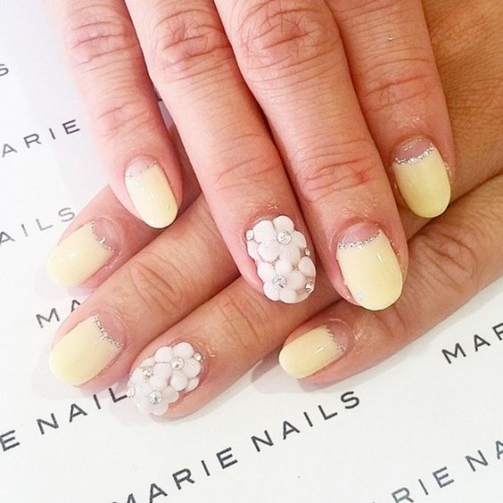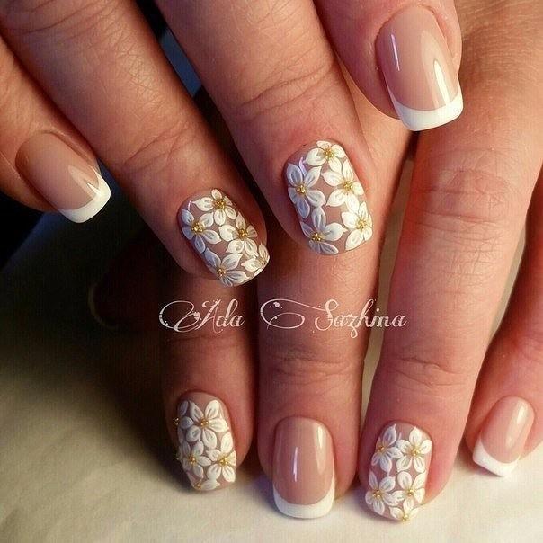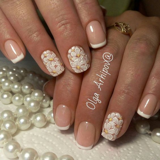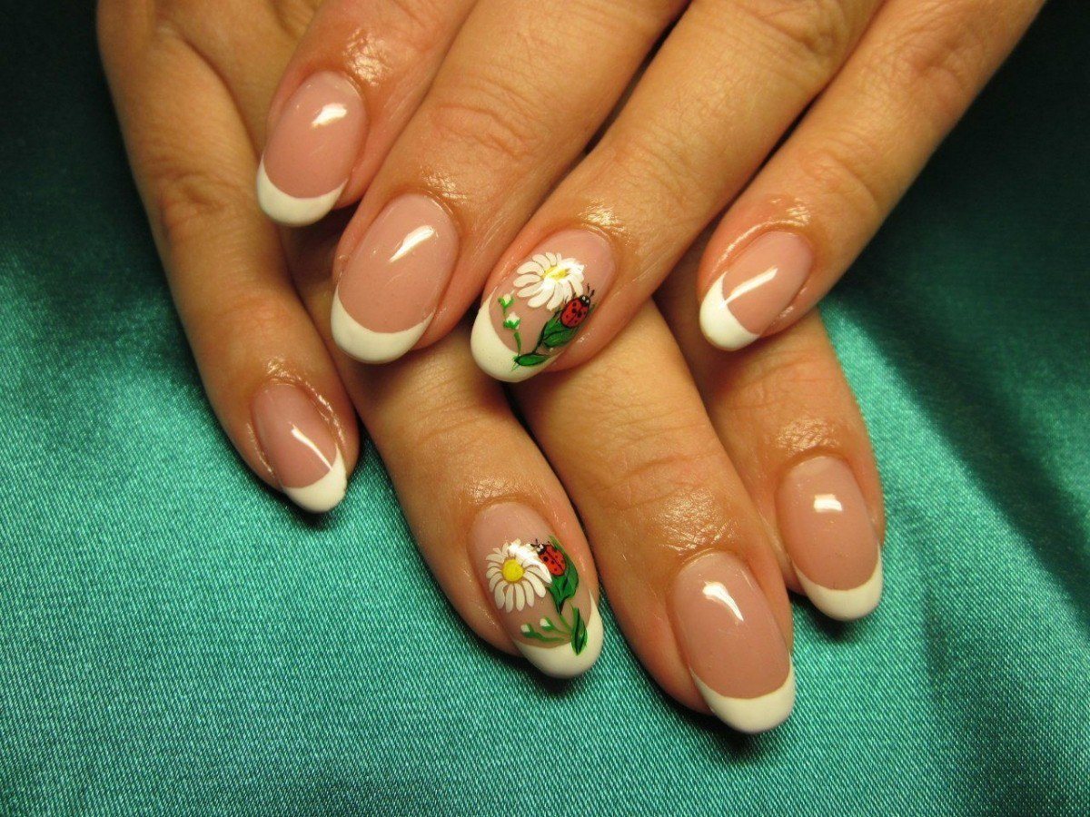 En effectuant une manucure française classique et en la complétant de délicates fleurs de camomille, vous obtiendrez un tout nouveau look pour vos ongles. Une telle manucure aura l’air original avec un sourire jaune, tout en laissant l’ensemble de l’ongle dans des tons incolores, avec plusieurs couleurs délicates éparpillées. Une excellente manucure française ressemble à de grandes fleurs sur un ongle, et des fleurs plus petites peuvent orner tous les autres ongles.