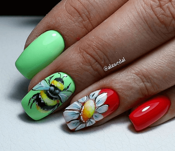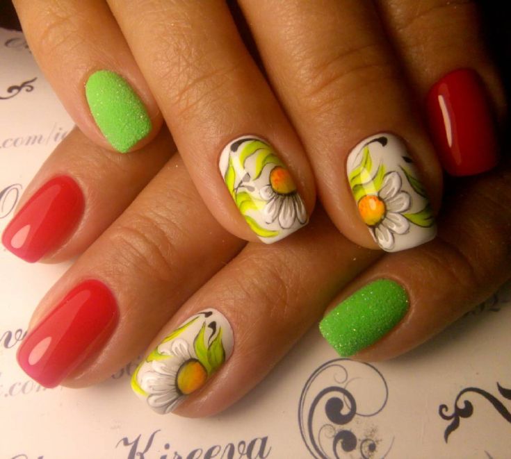 Si vous êtes une femme courageuse et moderne, mais que vous aimez en même temps les marguerites délicates, une manucure avec des fleurs sur un fond coloré est faite pour vous. Les marguerites sur fond clair de couleur rouge, bleue ou verte ne laisseront indifférent ni le propriétaire de la manucure, ni ceux qui l’entourent.