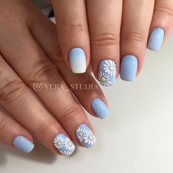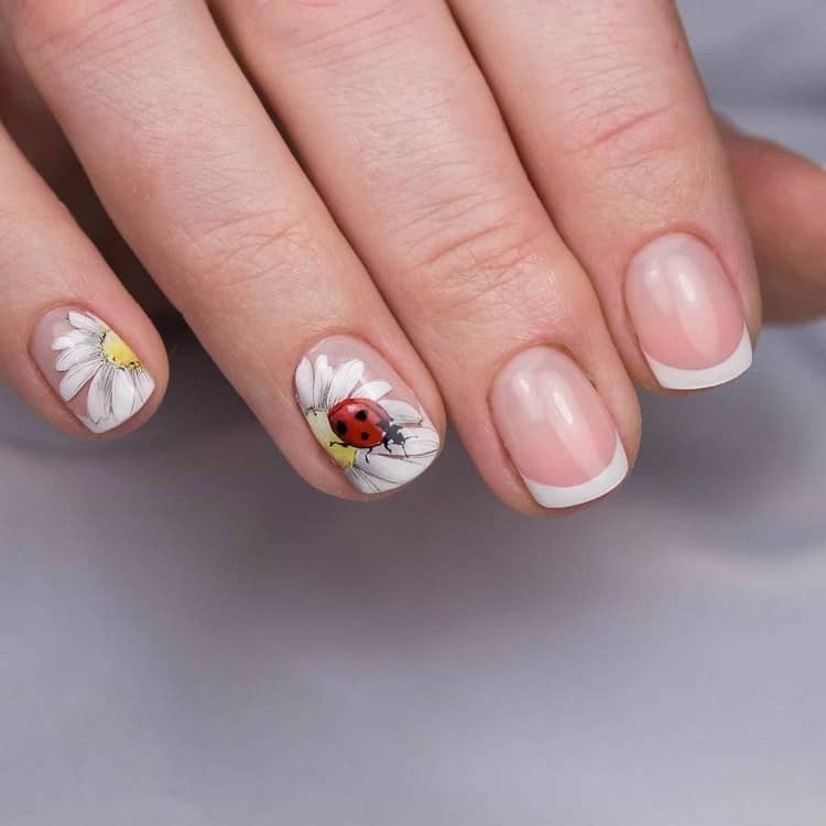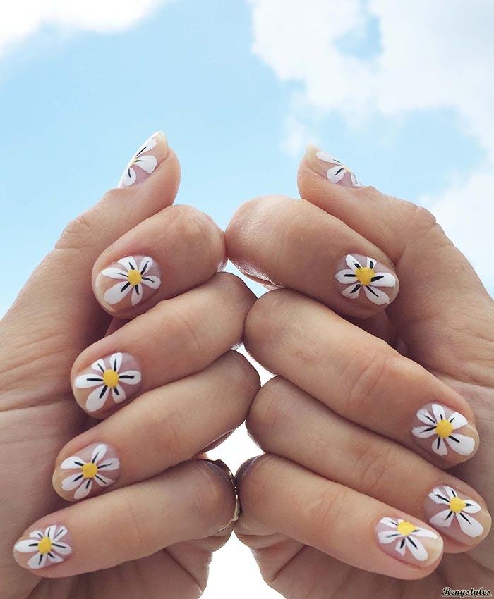 Manucure à ongles courts avec marguerites