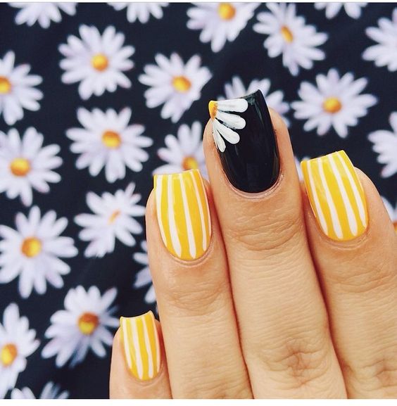 Très glamour et moderne ressemble à une manucure avec des marguerites en combinaison avec des motifs géométriques. Utilisez souvent des bandes, des points ou des cercles différents. Lorsque vous effectuez une manucure à rayures avec des marguerites, vous pouvez utiliser des rubans spéciaux, puis appliquer des marguerites de tailles et de formes choisies.