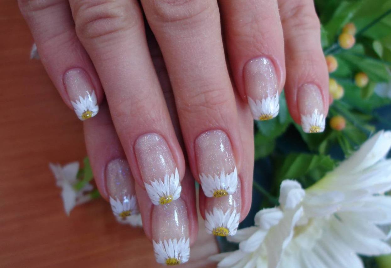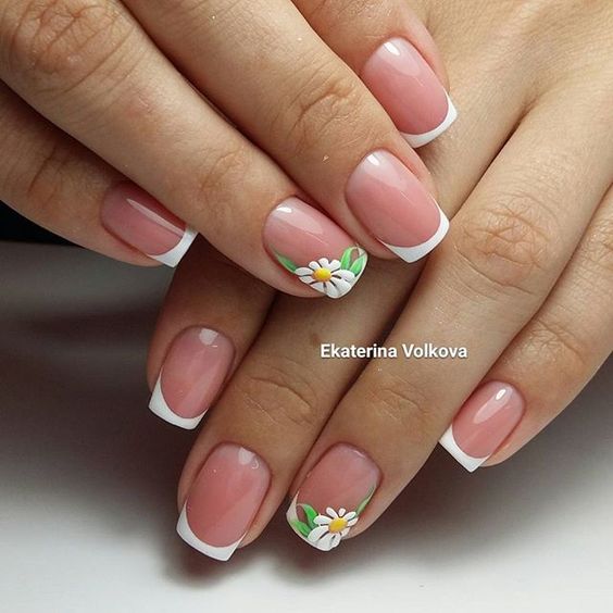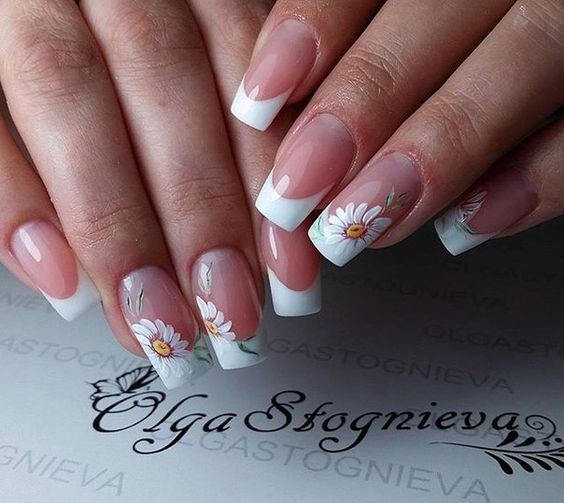 Manucure classique à la camomille avec marguerites