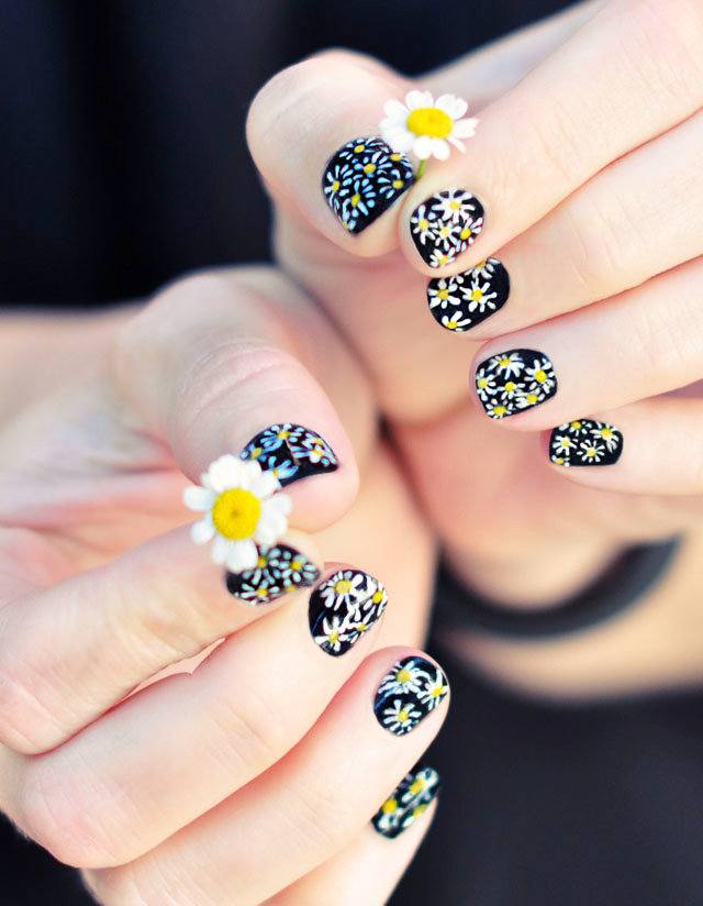 Magnifique manucure avec marguerites sur fond noir