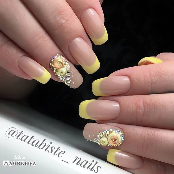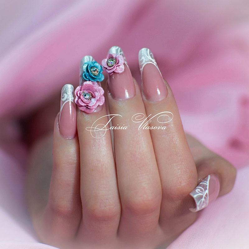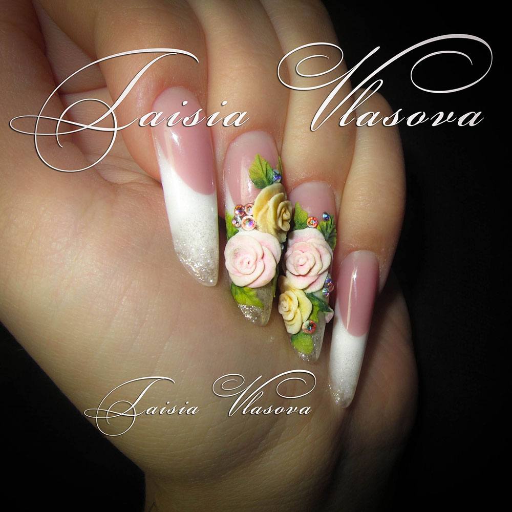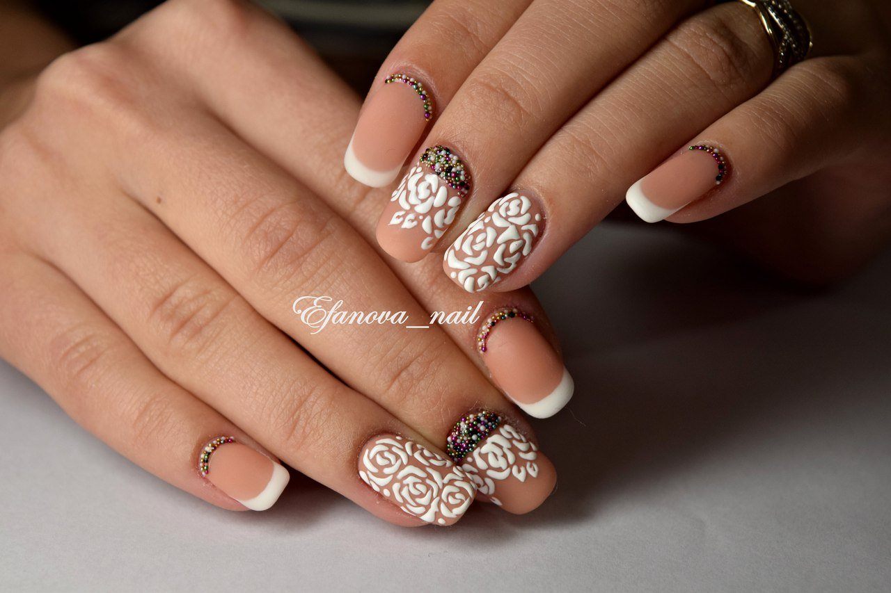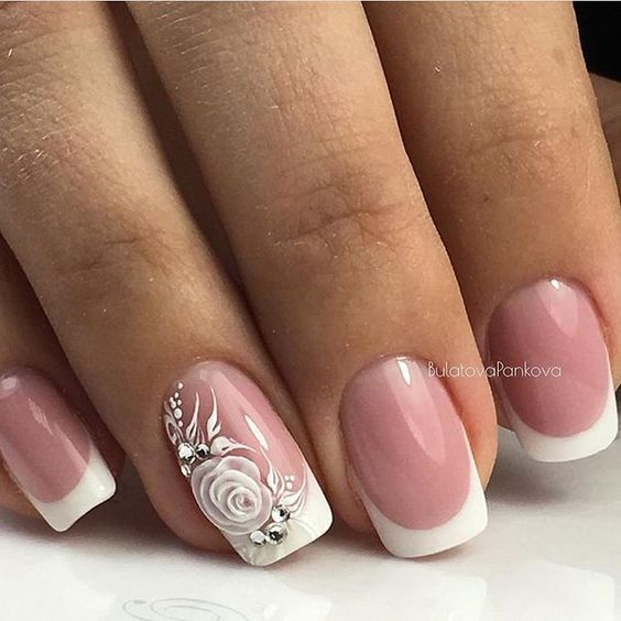 Pendant de nombreuses années, la manucure française est considérée comme une version classique de la conception de manucure, qui ne se démode pas en raison de son aspect délicat et unique. Pour une perception plus raffinée, la veste est complétée par des têtes de roses luxuriantes. Bien entendu, cette option de conception pour la manucure convient aux cérémonies de mariage, aux rendez-vous romantiques et aux occasions spéciales.