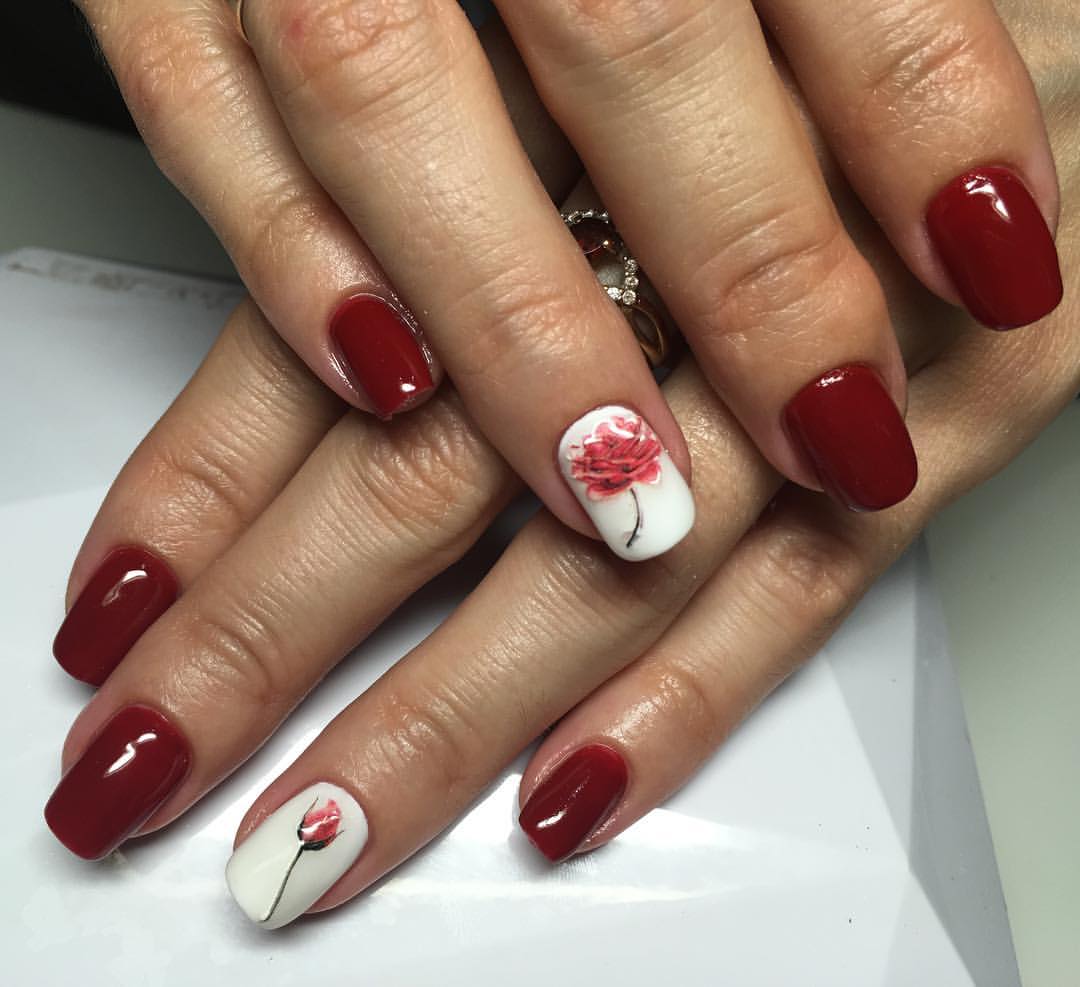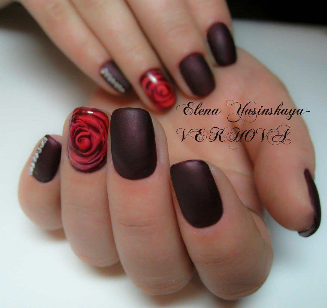 Manucure avec une rose de couleur bordeaux