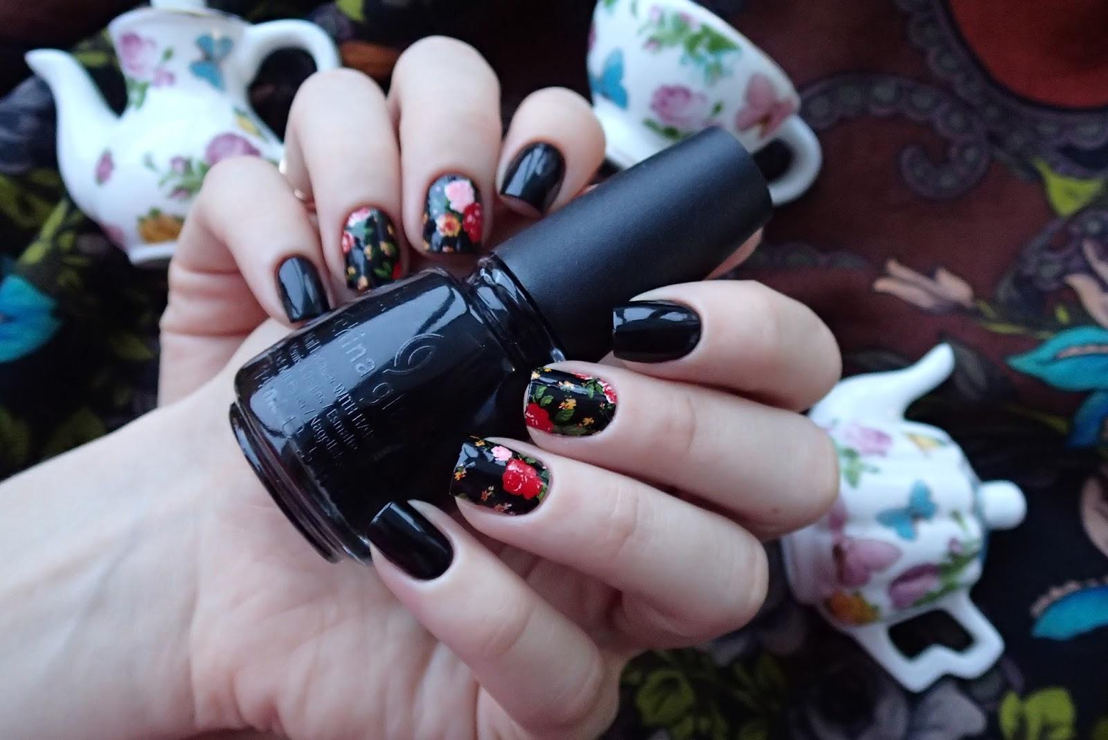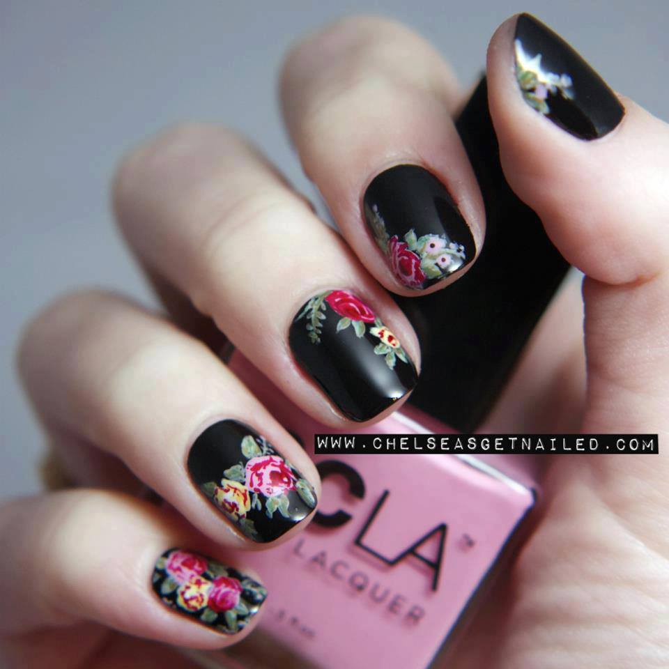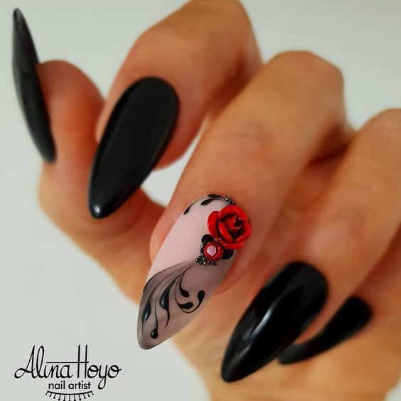 Manucure noire avec une rose