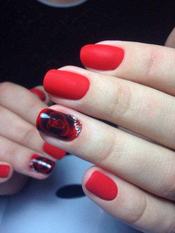 Une rose rouge est le signe d'une femme confiante, passionnée et déterminée. Beaucoup de filles habituées à se mettre à l'honneur préfèrent cette option de conception particulière pour la manucure. Sur le fond de la couleur rouge du vernis, différentes couleurs de peinture peuvent être utilisées: il peut s’agir de roses blanches à tiges vertes ou de roses noires ornées de pollen et de strass dorés.