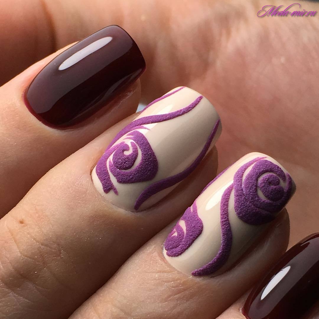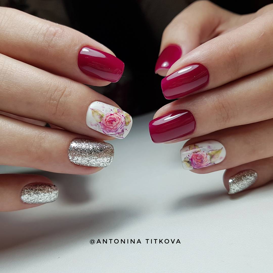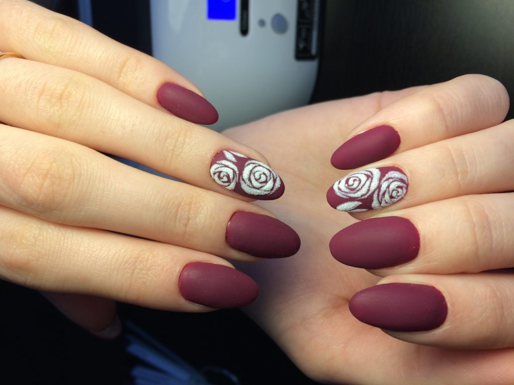 La couleur Bourgogne cette année est considérée comme la plus populaire. La teinte bordeaux est très pratique pour la manucure, car elle convient à n’importe quel jeu de couleurs de la garde-robe d’une femme. La couleur bordeaux elle-même est très riche, mais si elle est complétée par une délicate fleur de rose, elle sera encore plus expressive. Pour décorer des roses sur des ongles, on utilise souvent des paillettes, des strass, des perles, des confettis, du verre brisé.