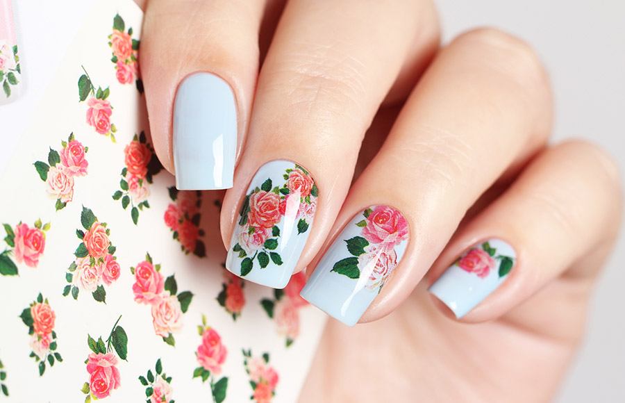 Beaucoup de filles et de femmes préfèrent la manucure de leurs propres mains, mais quand la question «Comment décorer vos ongles?» S’immobilise. Par conséquent, les autocollants avec des ornements prêts à l'emploi sont adaptés à ces options. La rose est considérée comme le motif le plus populaire pour les autocollants, il ne sera donc pas difficile de les trouver pour les acheter. Avant d'utiliser les autocollants, vous devez les répartir correctement sur l'ongle, puis les coller. Pour une meilleure fixation, l’image doit être recouverte d’un plateau spécial.