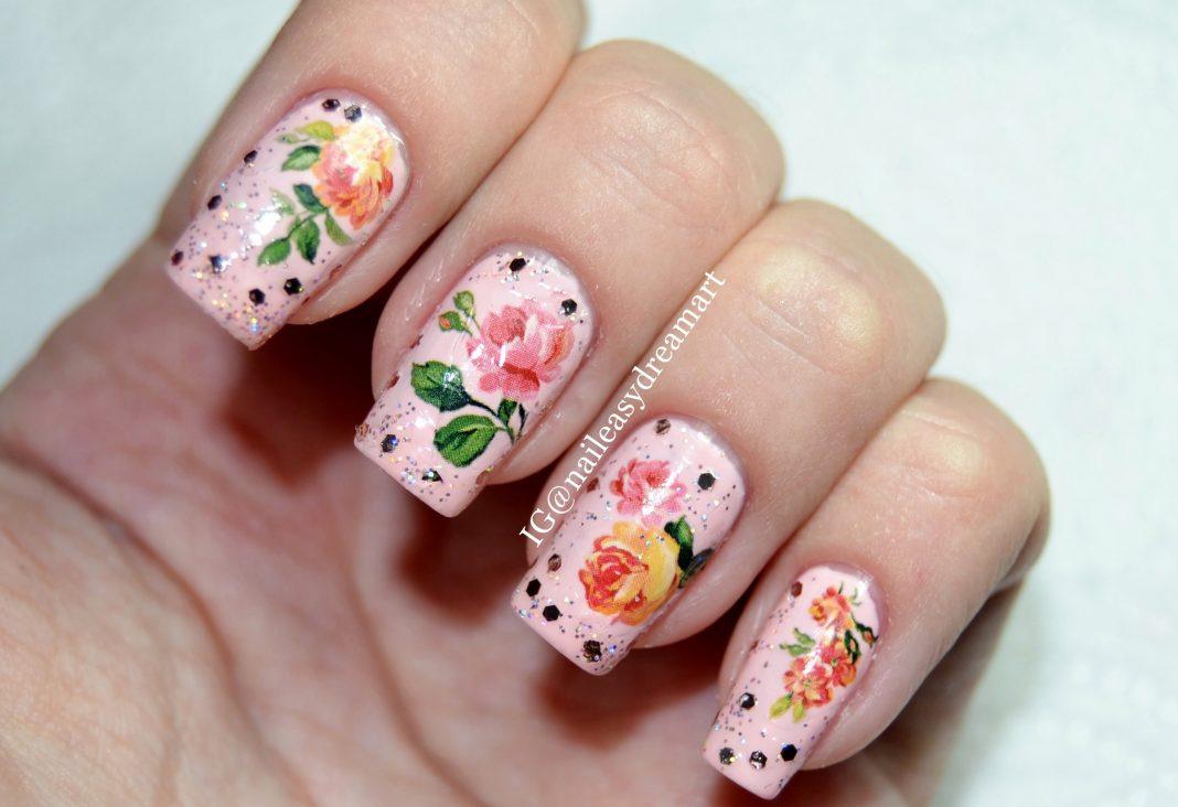 Conception de manucure avec des roses sur la photo.