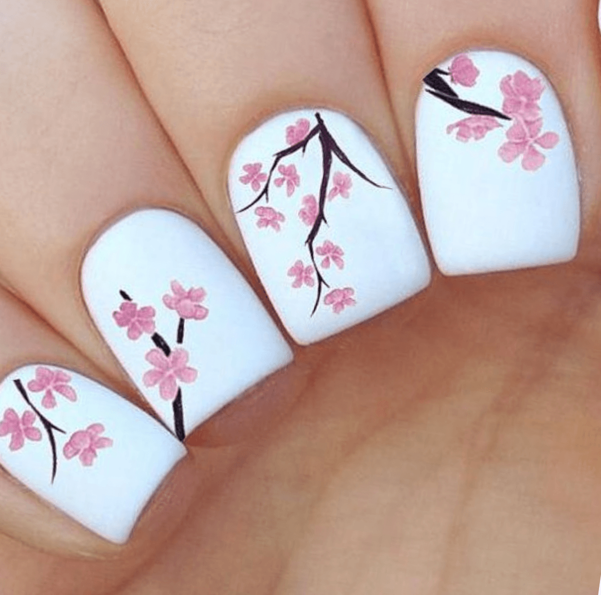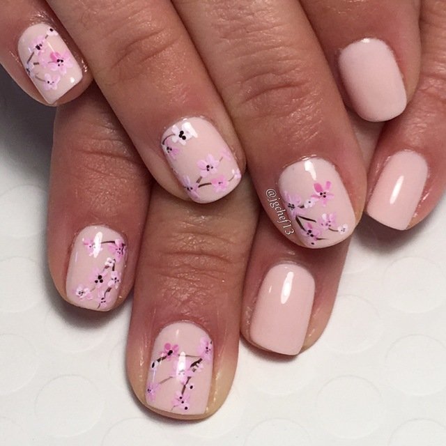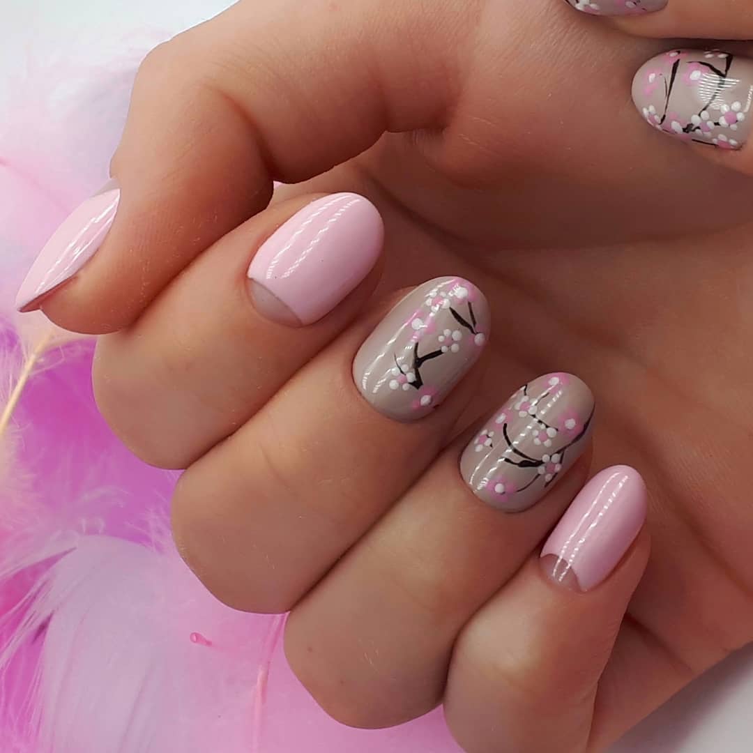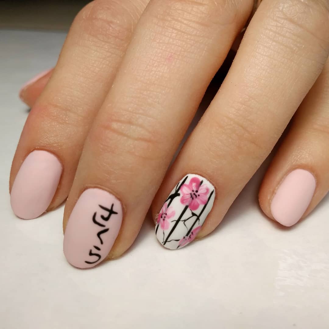 Les amateurs de manucure à la maison devraient commencer par cette option. Vous devez d’abord appliquer une couche monophonique sur tous les ongles et attendre qu’elle sèche complètement. Ensuite, appliquez les branches avec un pinceau fin et de la peinture noire. Veuillez noter qu'il est préférable que le motif ne soit placé que sur quelques ongles. Avec un pinceau légèrement plus large et de la peinture rose, appliquez l’image de fleurs sur les branches. Si vous le souhaitez, le milieu de chaque bouton peut être marqué d'une nuance légèrement plus foncée.