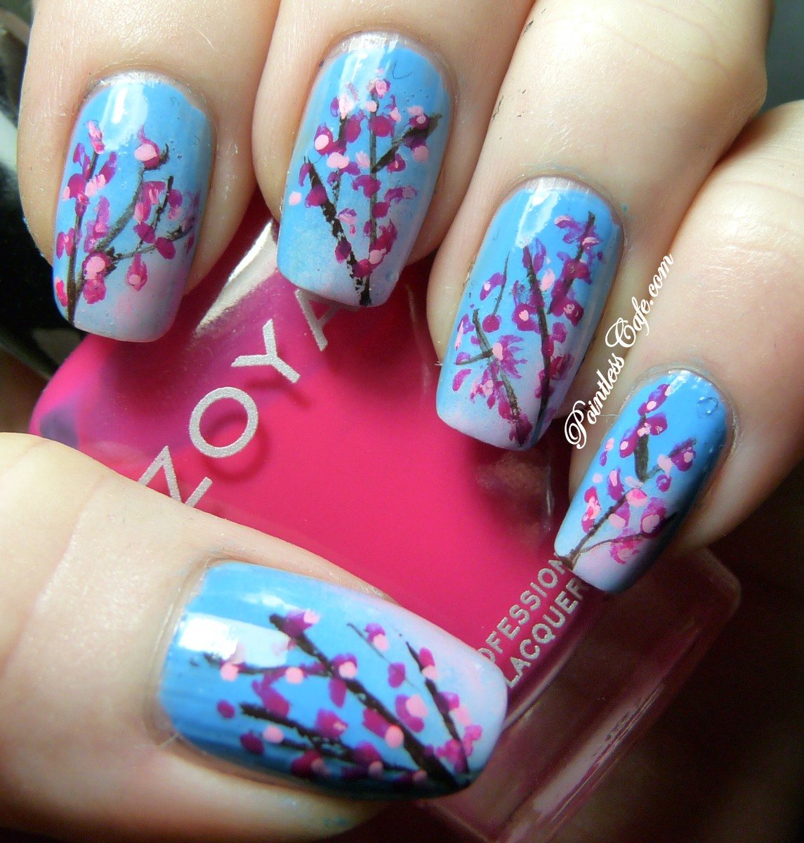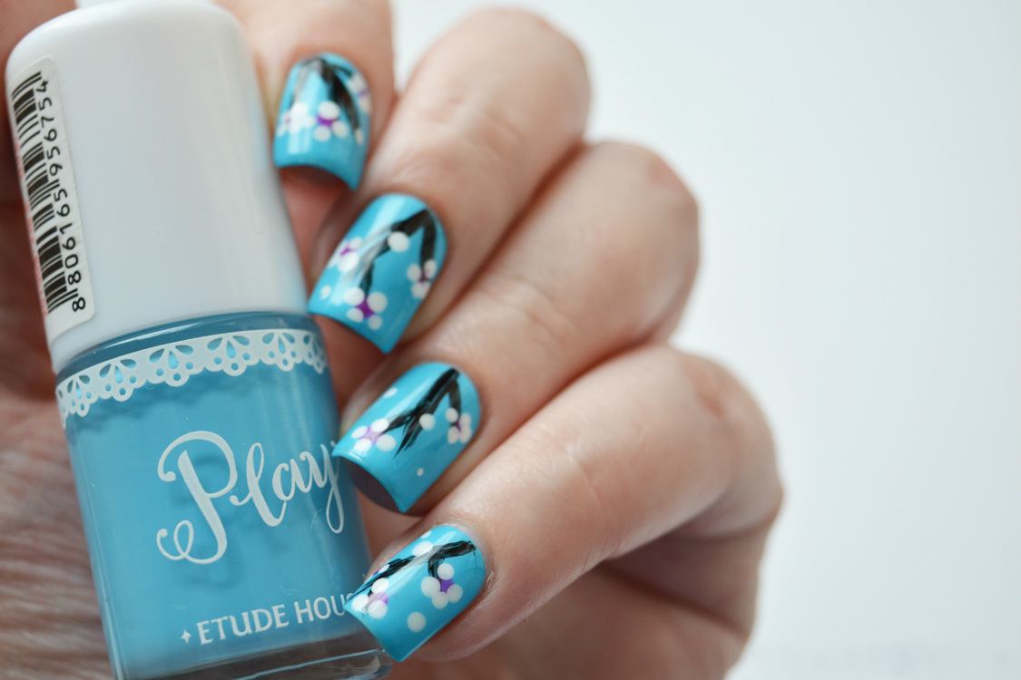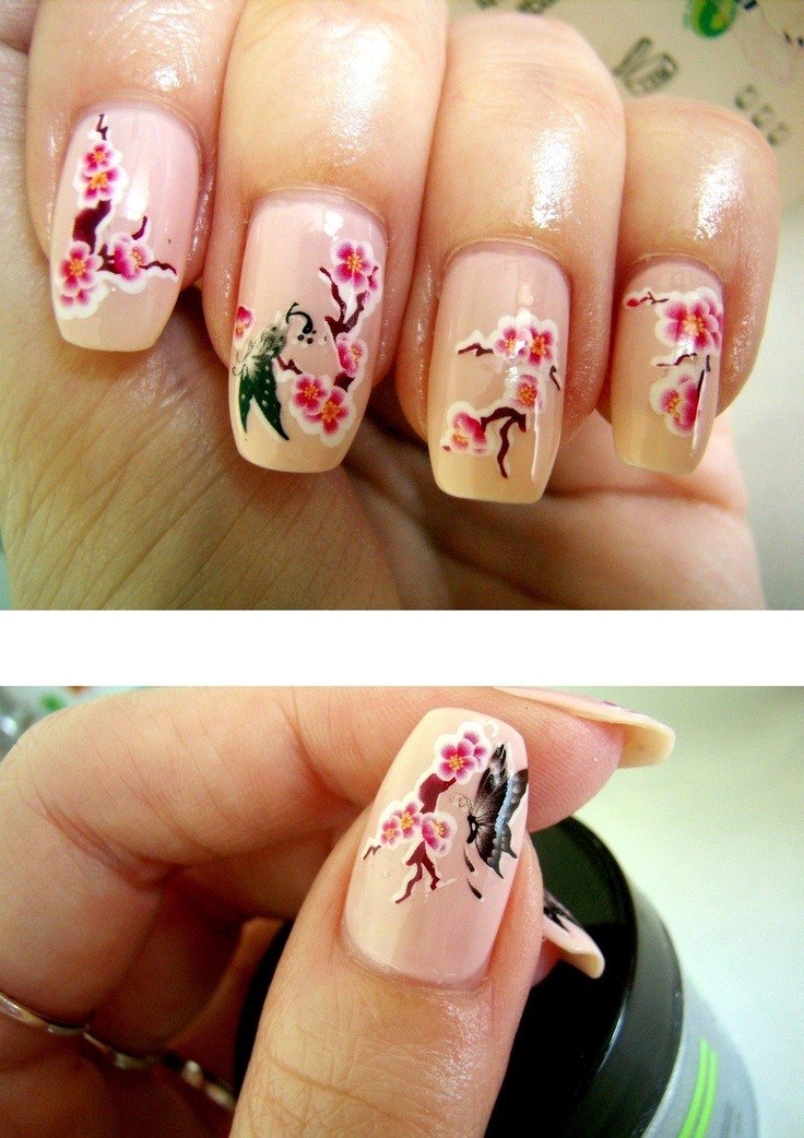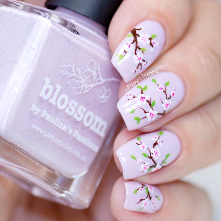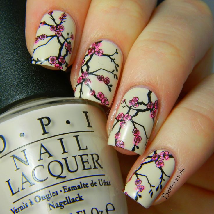 Les amateurs de manucure à la maison devraient commencer par cette option. Vous devez d’abord appliquer une couche monophonique sur tous les ongles et attendre qu’elle sèche complètement. Ensuite, appliquez les branches avec un pinceau fin et de la peinture noire. Veuillez noter qu'il est préférable que le motif ne soit placé que sur quelques ongles. Avec un pinceau légèrement plus large et de la peinture rose, appliquez l’image de fleurs sur les branches. Si vous le souhaitez, le milieu de chaque bouton peut être marqué d'une nuance légèrement plus foncée.