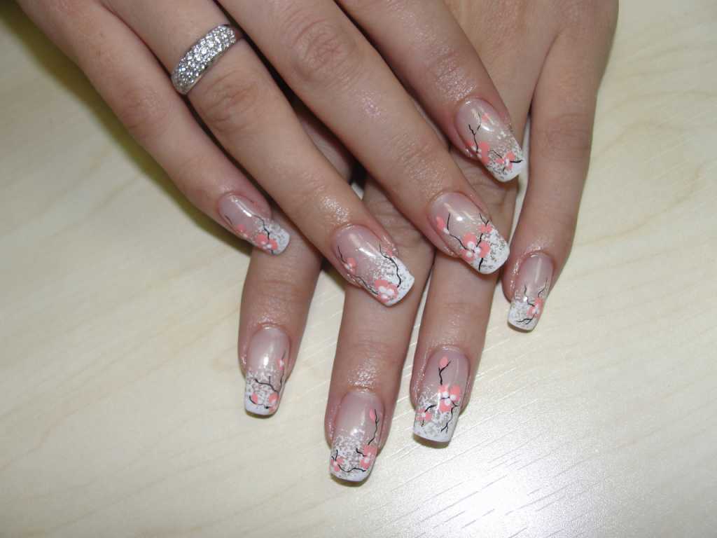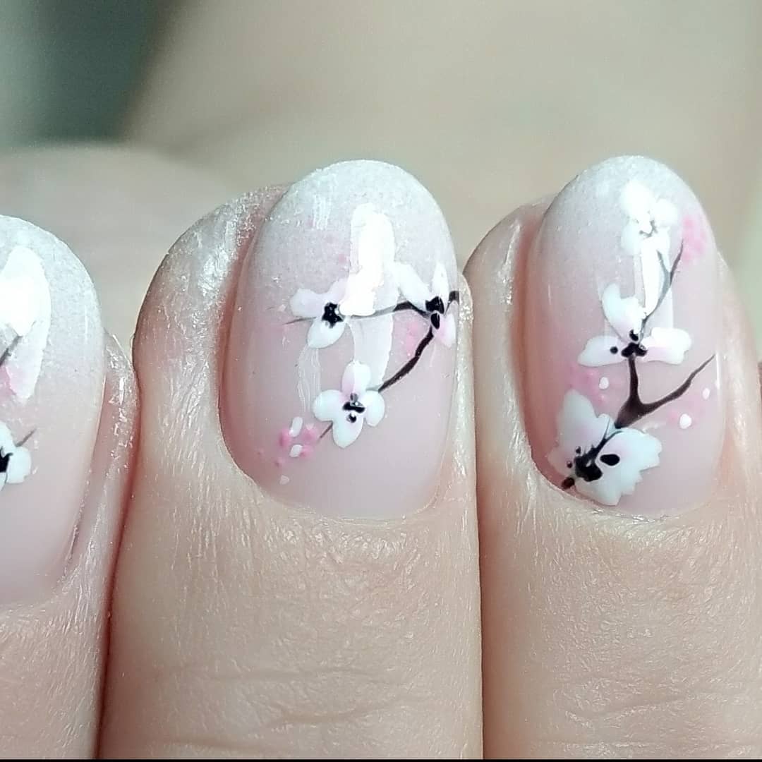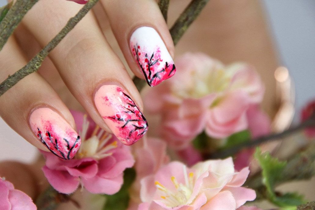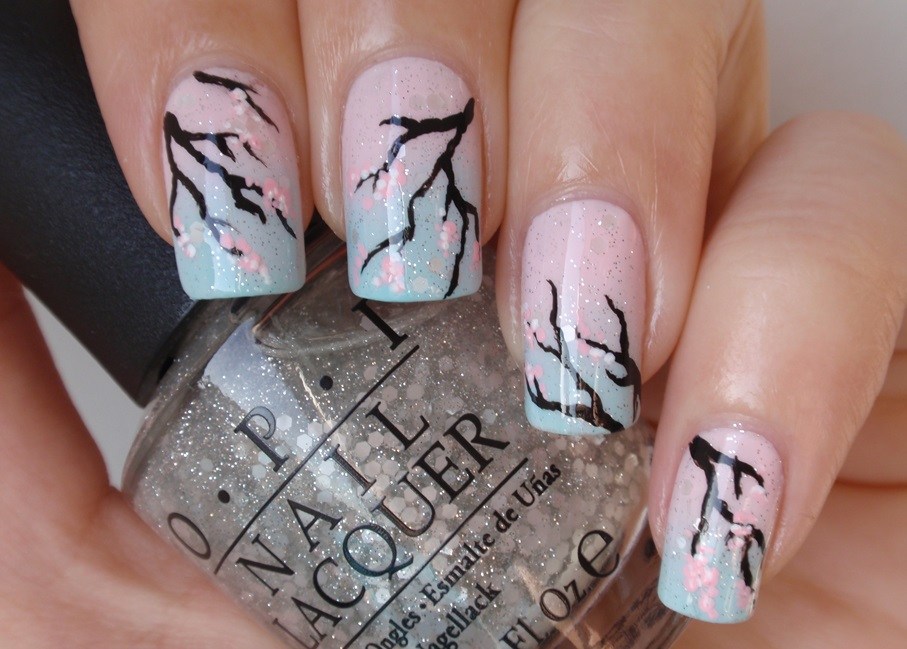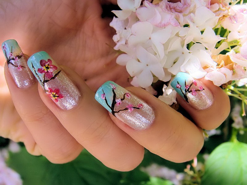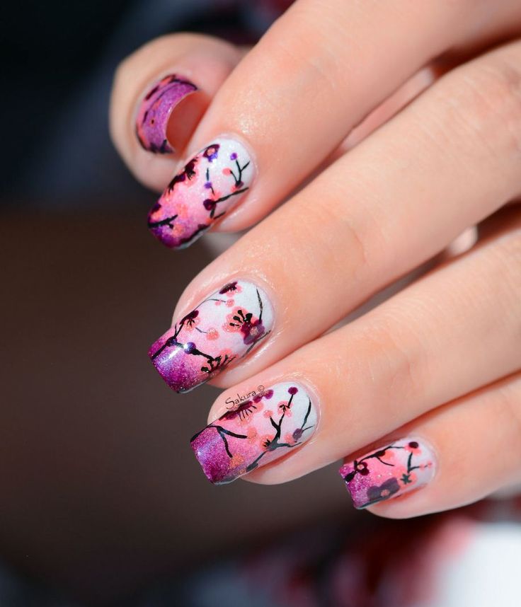 Manucure dégradée sous la forme d'une transition en douceur des nuances en elle-même est incroyablement belle. Et peu importe qu’il y ait des couleurs vives ou pastel. L'important est qu'elles se marient bien avec le jeu de couleurs que vous avez sélectionné pour le motif sakura. À propos, une telle manucure est particulièrement populaire auprès des vrais fashionistas.