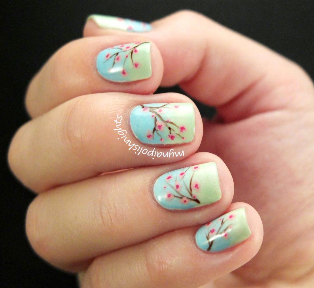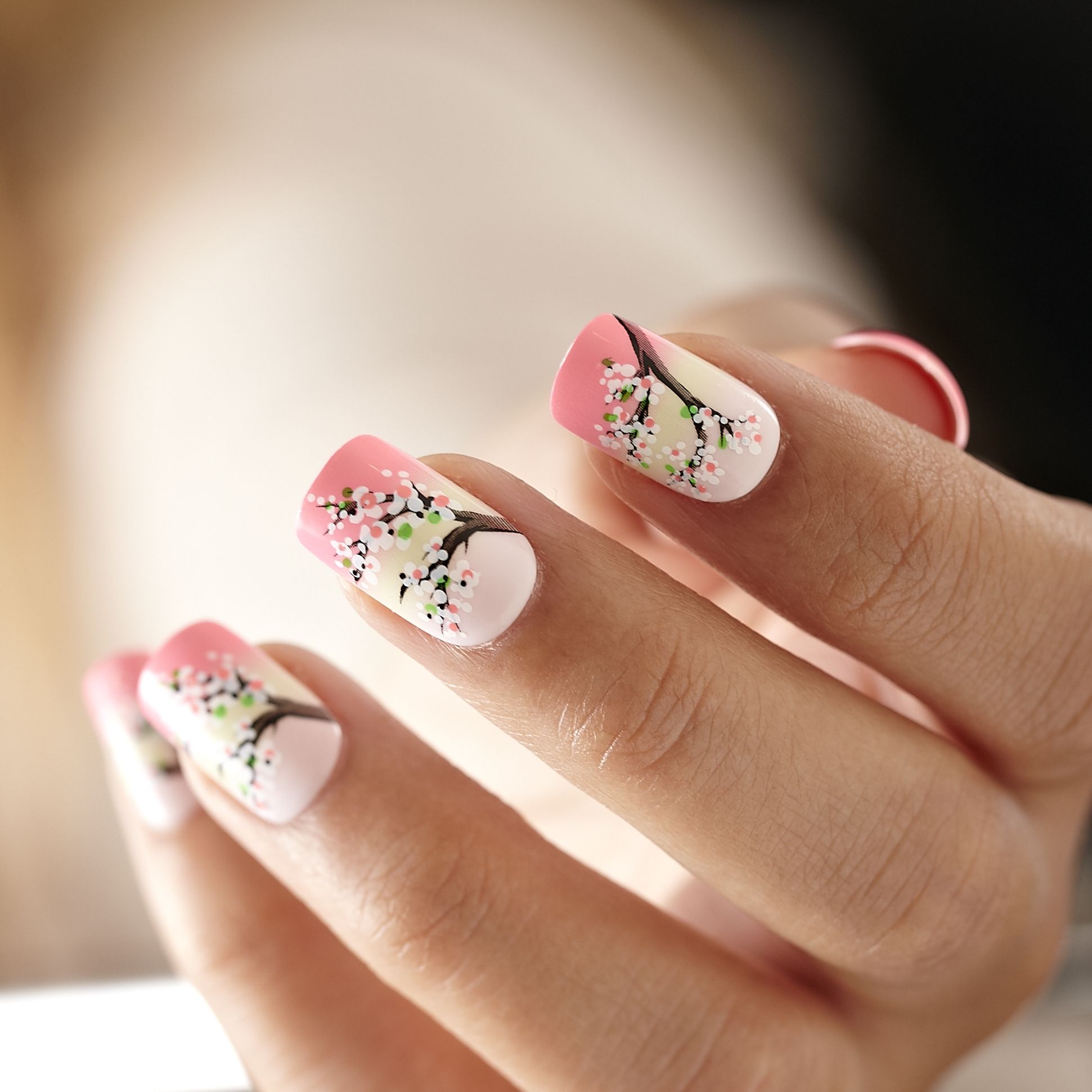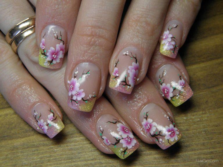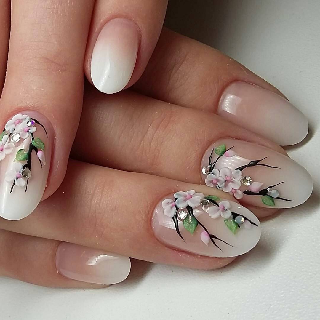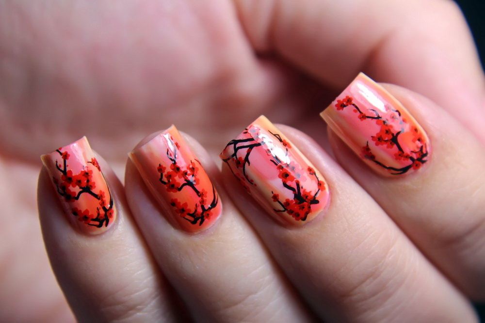 Manucure dégradée sous la forme d'une transition en douceur des nuances en elle-même est incroyablement belle. Et peu importe qu’il y ait des couleurs vives ou pastel. L'important est qu'elles se marient bien avec le jeu de couleurs que vous avez sélectionné pour le motif sakura. À propos, une telle manucure est particulièrement populaire auprès des vrais fashionistas.