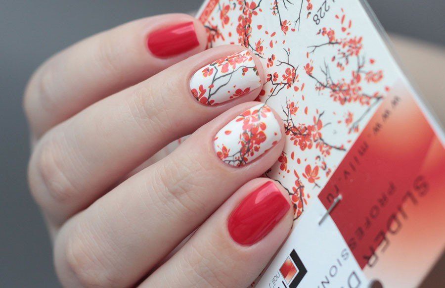 Pour les brindilles, il est préférable d'utiliser un vernis de couleur noire ou brune. La deuxième option est choisie plus souvent, car dans ce cas, le design est plus doux, plus délicat. À leur tour, les fleurs elles-mêmes peuvent être vues en blanc, rose, lilas, écarlate, orange et même rouge. Chaque option à sa manière semble attrayante sur les ongles.