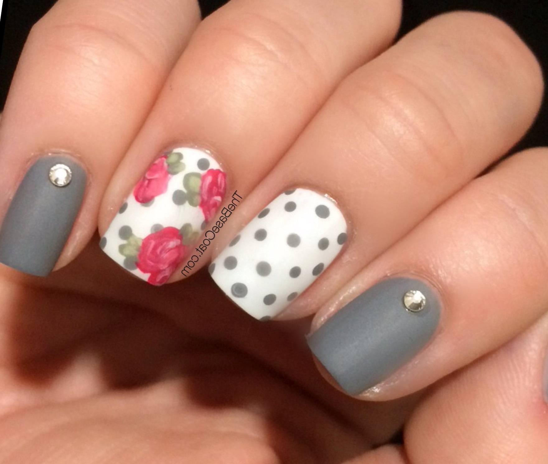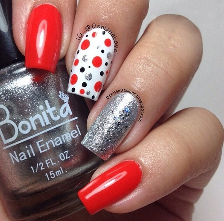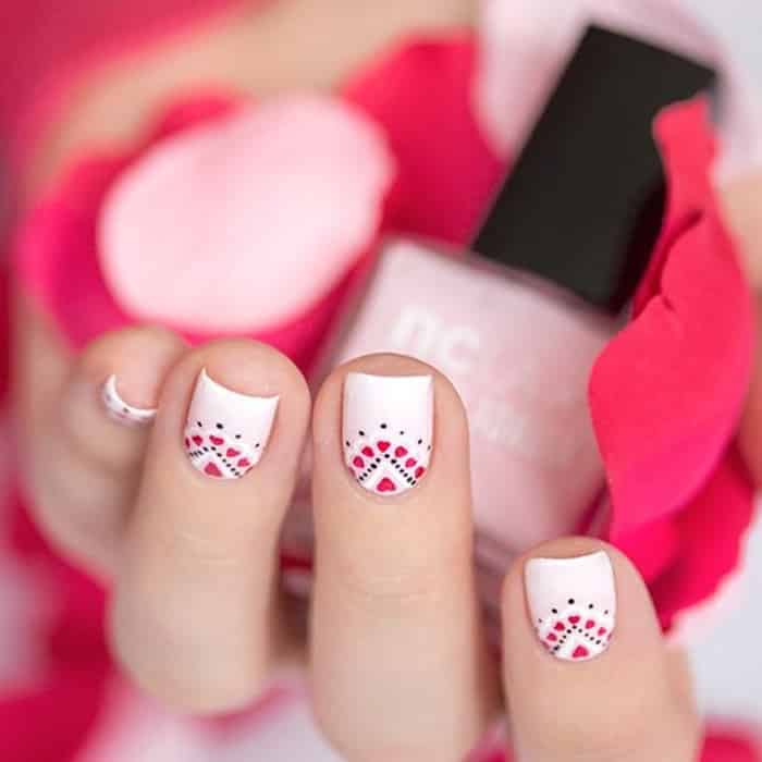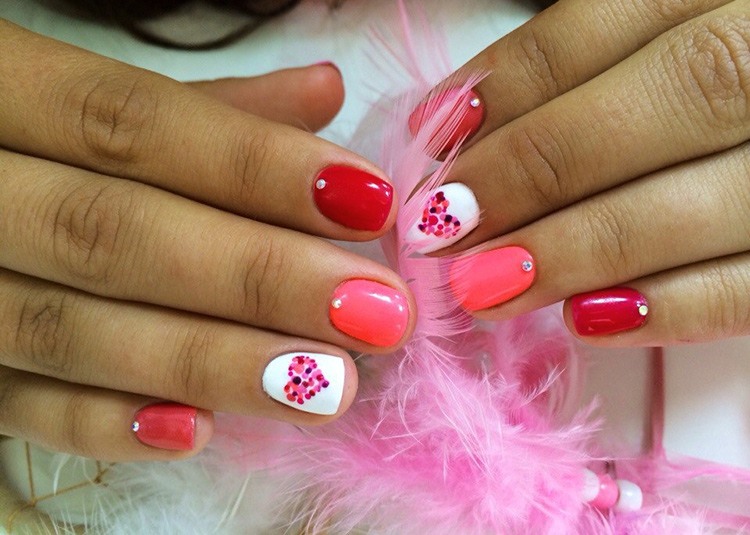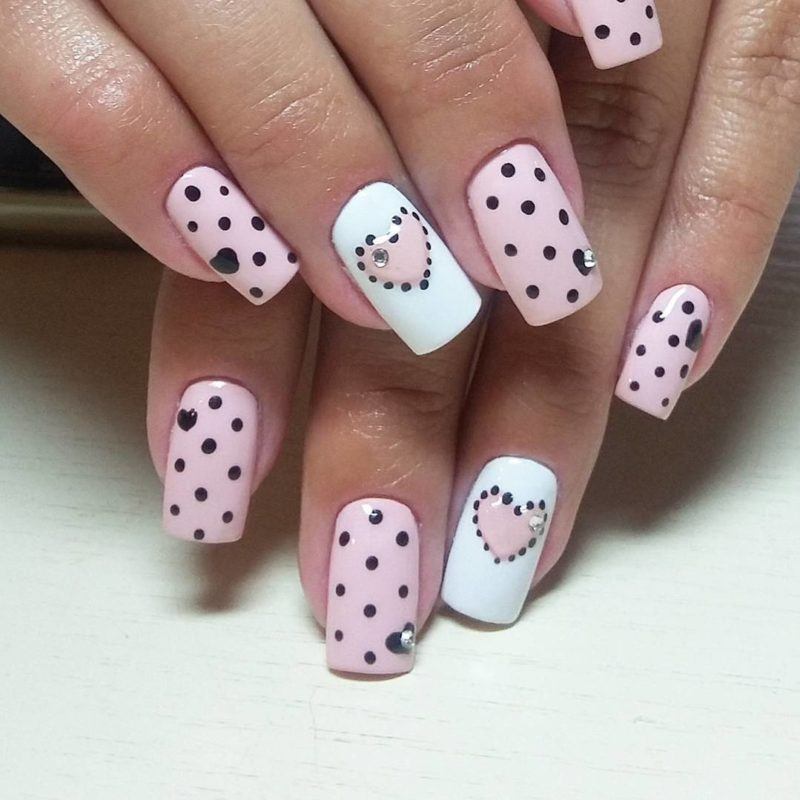 - Manucure avec des points, des rayures et des coeurs.